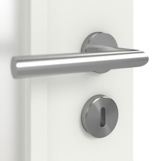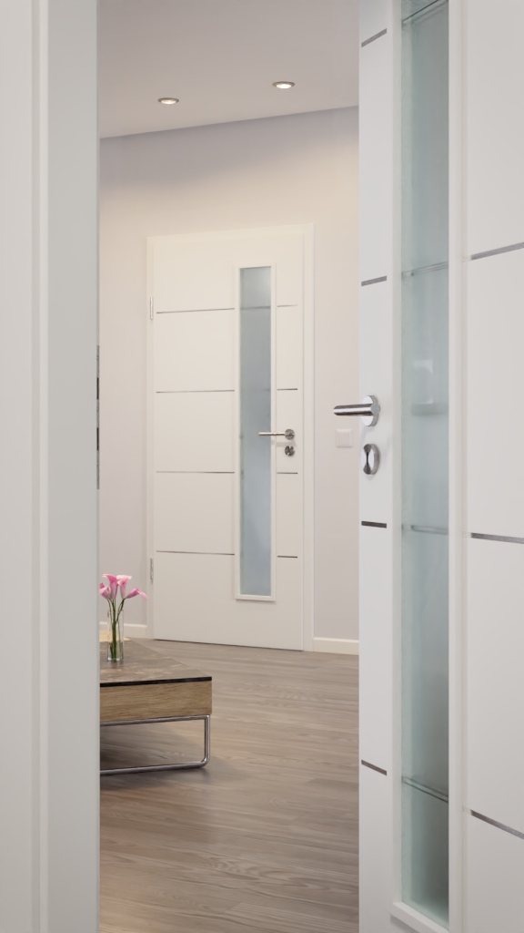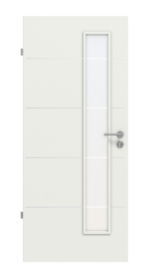 W tych drzwiach kluczowe jest połączenie dwóch elementów: z jednej strony biała powierzchnia emanuje harmonijnym urokiem. Z drugiej strony wąski, zamkowy otwór świetlny wprowadza nieco światła do Twojego wnętrza. Cztery poziome paski pełnią rolę łącznika między tymi dwoma elementami.