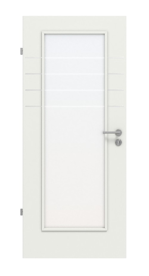 Dzięki białej powierzchni powstaje nowoczesny design drzwi, który jest ożywiony przez szeroki przeszklenie. Jako element łączący działają cztery paski w górnej części skrzydła drzwi, które biegną poziomo.