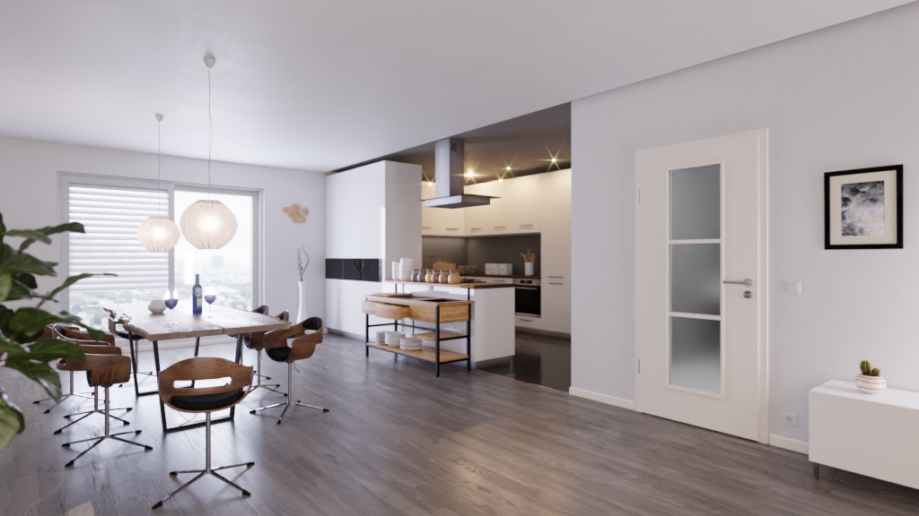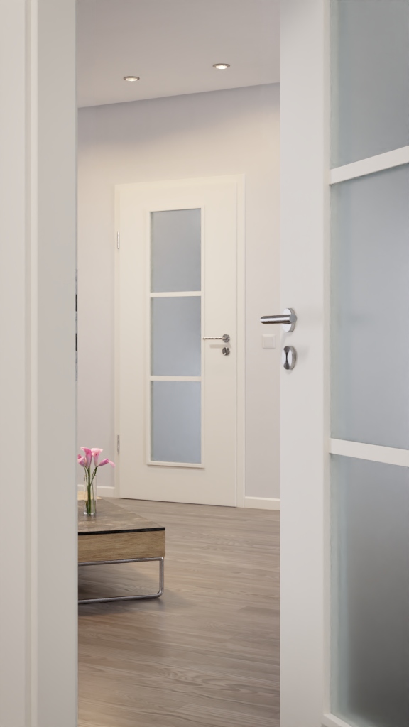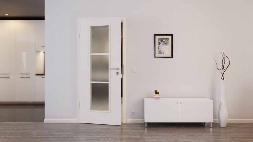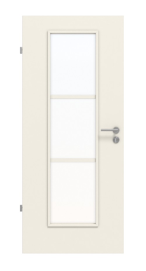 Jasna powierzchnia tworzy elegancki design drzwi, który pasuje do niemal każdego wystroju wnętrza. Dodatkowo w środkowej części skrzydła drzwiowego znajduje się szerokie, podzielone na trzy części wycięcie na szybę, które przepuszcza dużo światła. Niezbędne szklenie jest wliczone w cenę.