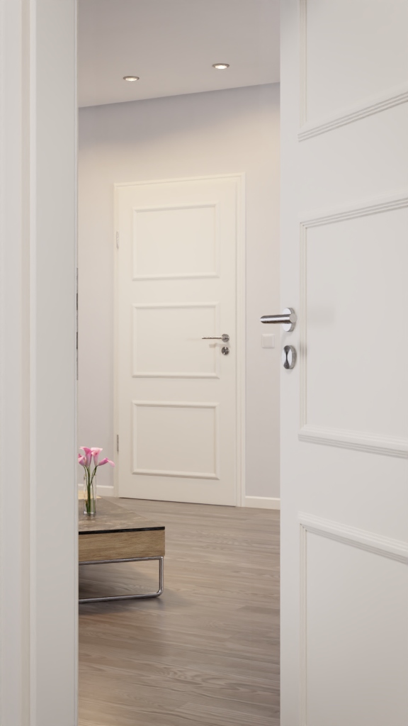 W pomieszczeniu wewnętrznym budowa obejmuje solidną wkładkę z płyty wiórowo-otworowej , która zapewnia stabilność podczas codziennego użytkowania. Szczególny akcent nadają profilowane ramy nakładane, które podkreślają optykę drewnianych wypełnień. Wysokiej jakości lakierowane białe elementy, stylowo zaokrąglone, dopełniają ponadczasowy, klasyczny charakter drzwi wewnętrznych.