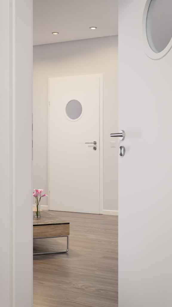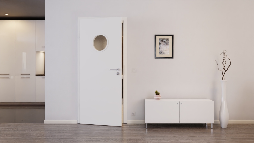 Dzięki lakierowanej powierzchni w kolorze białym 9016, te drzwi są łatwe do czyszczenia. Dodatkowym atutem jest przeszklenie, które tworzy przytulną atmosferę i może być wyposażone w klasyczne przezroczyste szkło lub modną wariację szkła.