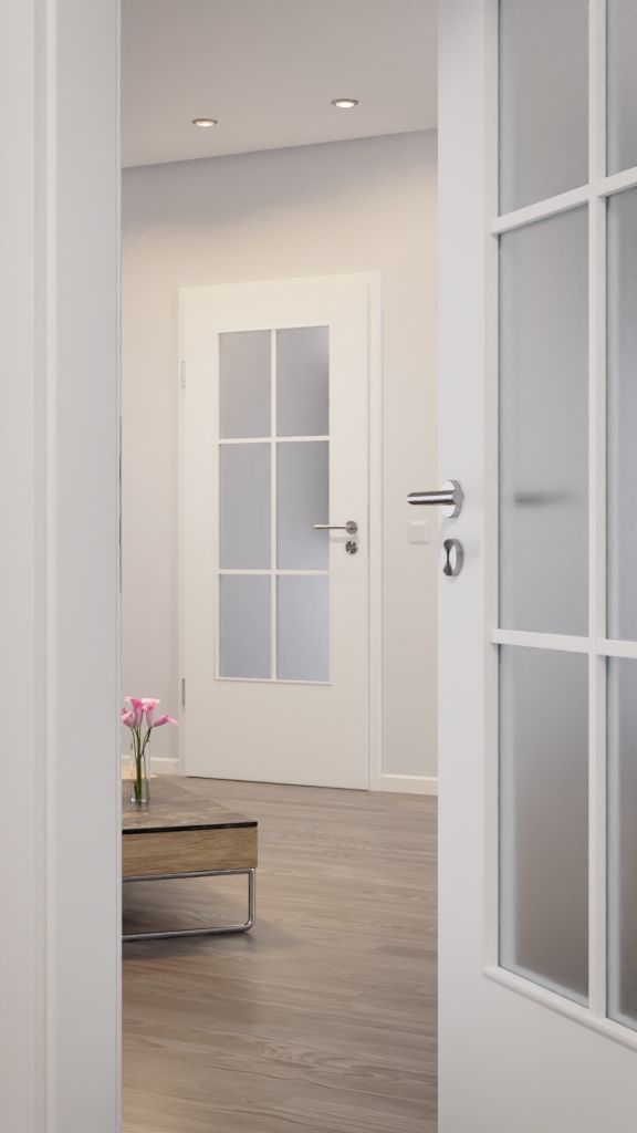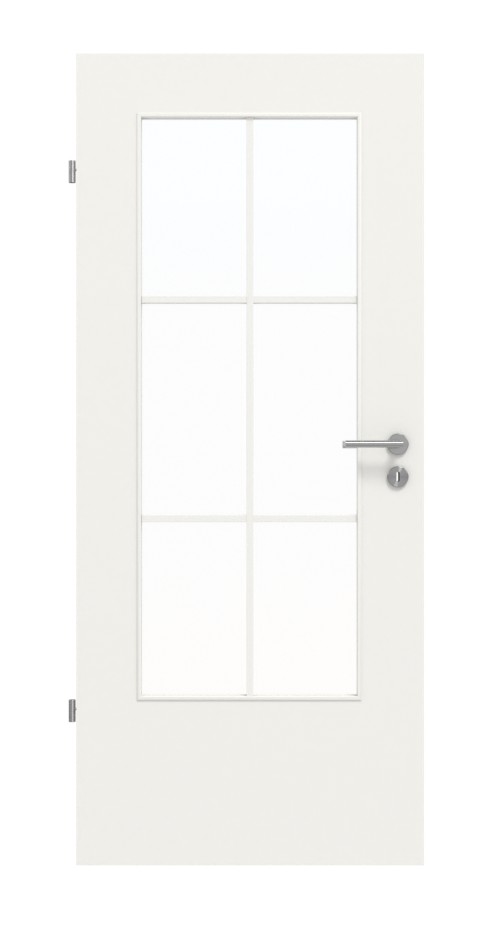 Powierzchnia lakierowana tych drzwi w sprawdzonym białym kolorze 9016 łatwo się czyści. Elegancki przeszklenie tworzy jasną i przytulną atmosferę. W zależności od preferencji, można je wyposażyć w klasyczne przezroczyste szkło lub interesującą wariację szklanych elementów.