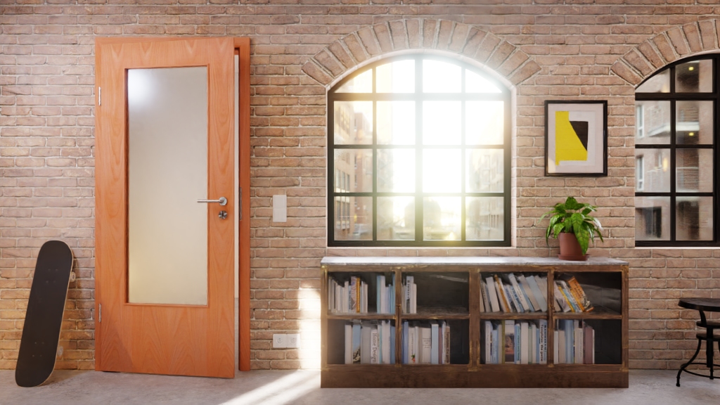 Zrównoważone drzwi drewniane z wycięciem na szybę; Wytrzymała okleina zforniru drewnianego w kolorze buku Classic i naturalny wygląd to charakterystyczne cechy drzwi wewnętrznych Optima firmy Jeld-Wen z otworem świetlnym.