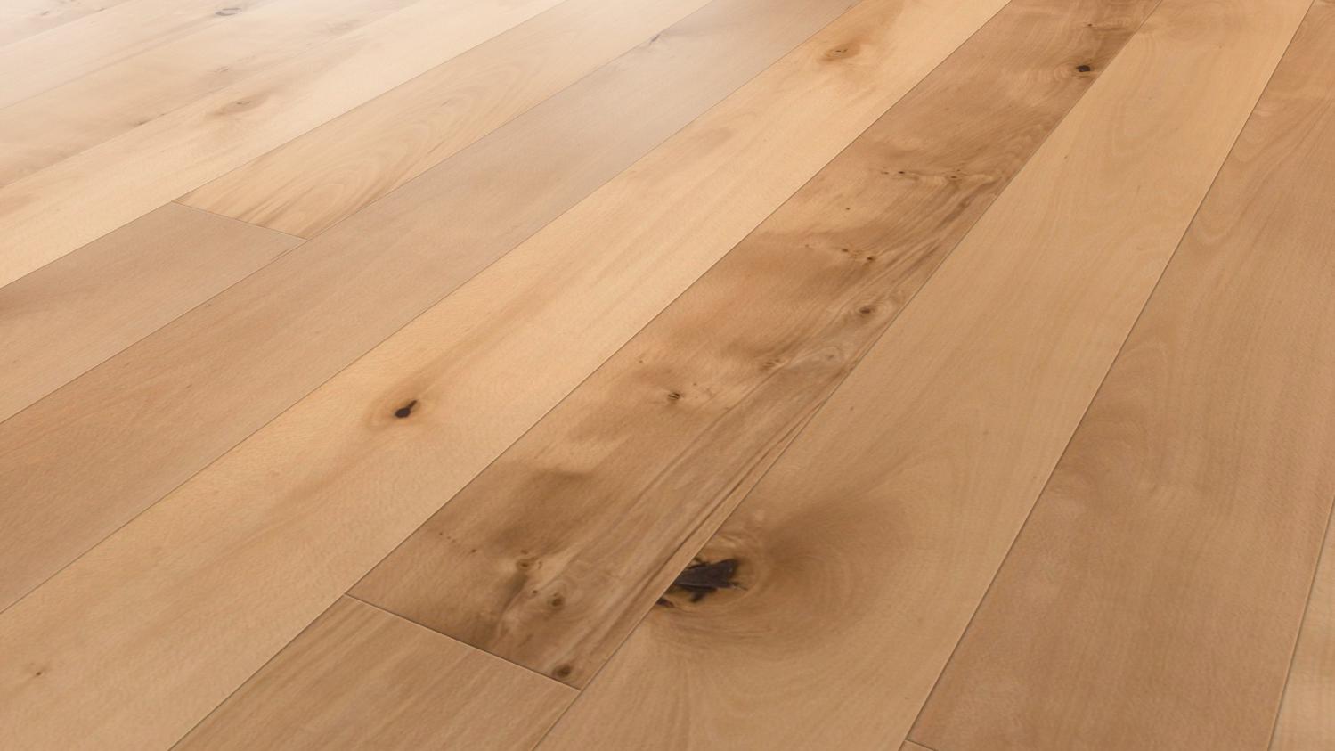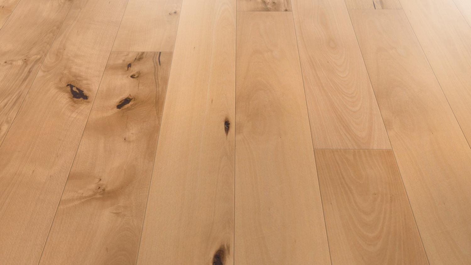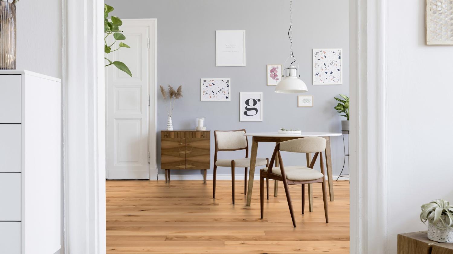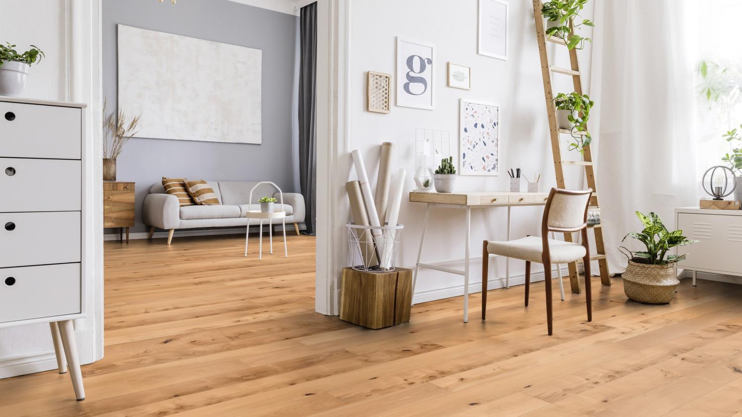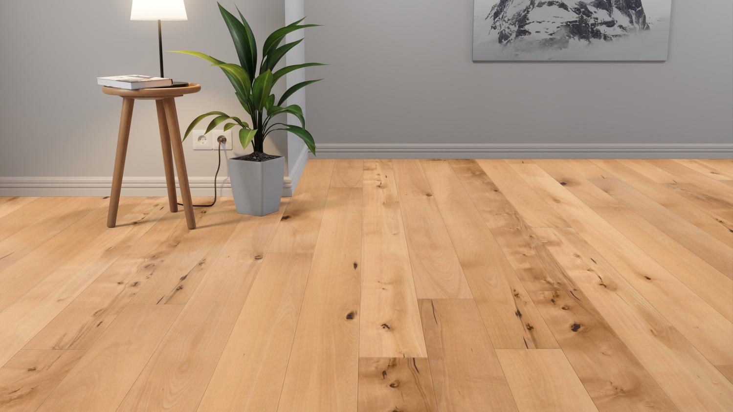 Dzięki jasnej kolorystyce i fugom w kształcie litery V deski w stylu rustykalnym nadadzą wnętrzu swobodną atmosferę w duchu skandynawskim. Drewno bukowe podkreśli naturalny wygląd drewna poprzez wyraźnie widoczne sęki i pęknięcia.