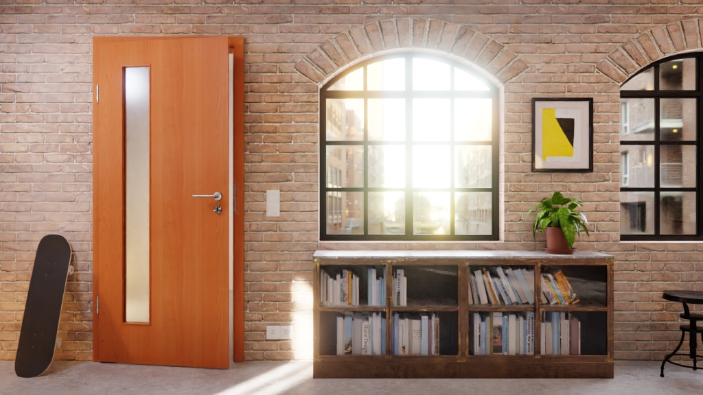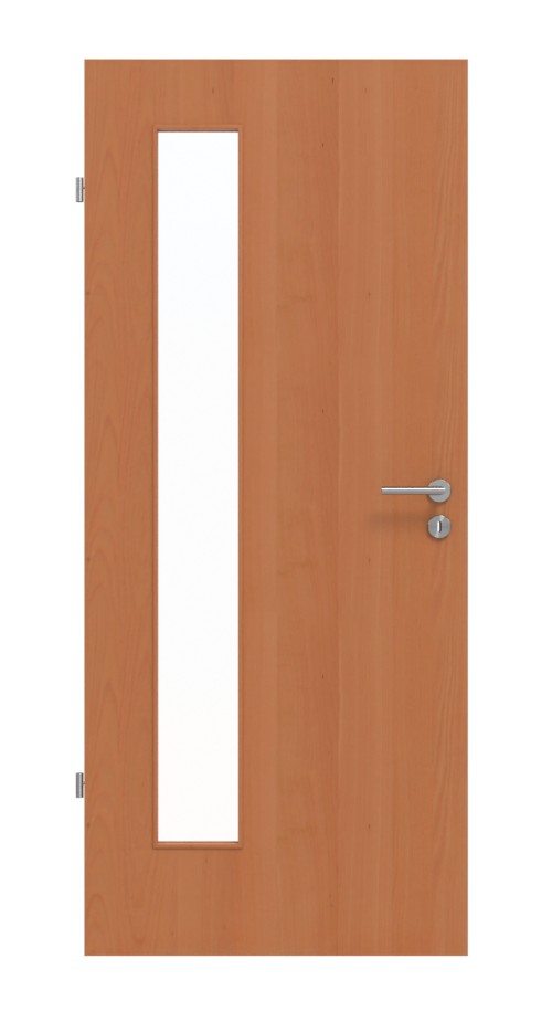 Zrównoważone drzwi drewniane z wycięciem na szybę; wytrzymała okleina z forniru w kolorze buk Living i naturalny wygląd cto cechy szczególne drzwi wewnętrznych Optima firmy Jeld-Wen z otworem świetlnym.