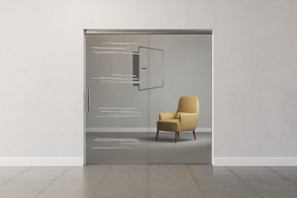 Całkowita szerokość zabudowy szklanej rozkłada się równomiernie na skrzydło drzwiowe i element boczny, dzięki czemu powstaje symetryczne wykończenie wizualne.