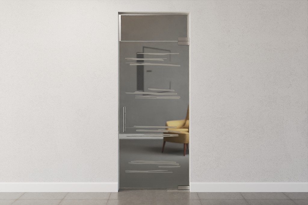 Elegancka całoszklana konstrukcja z drzwiami wahadłowymi i świetlikiem, solidna i trwała dzięki specjalnie pokrytemu szkłu bezpieczeństwa: