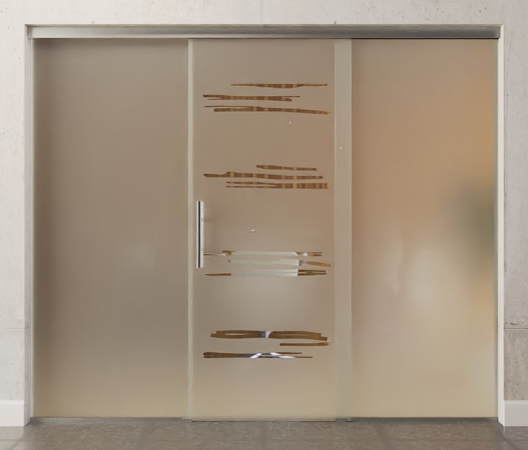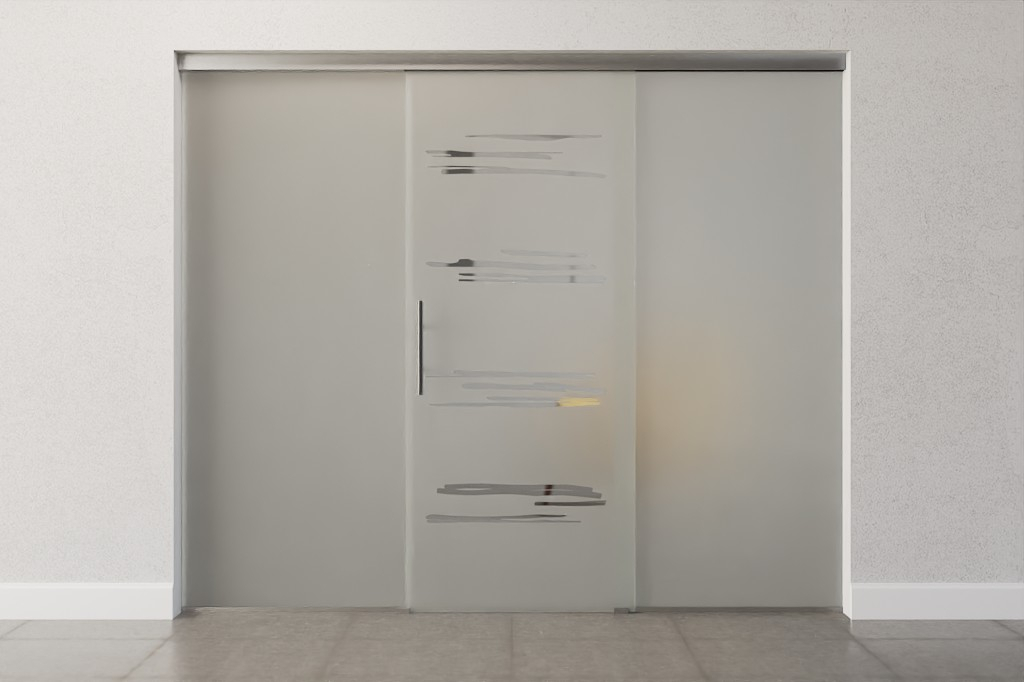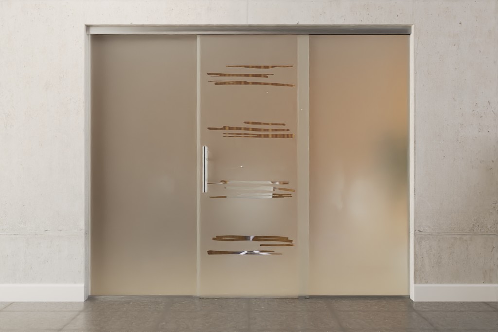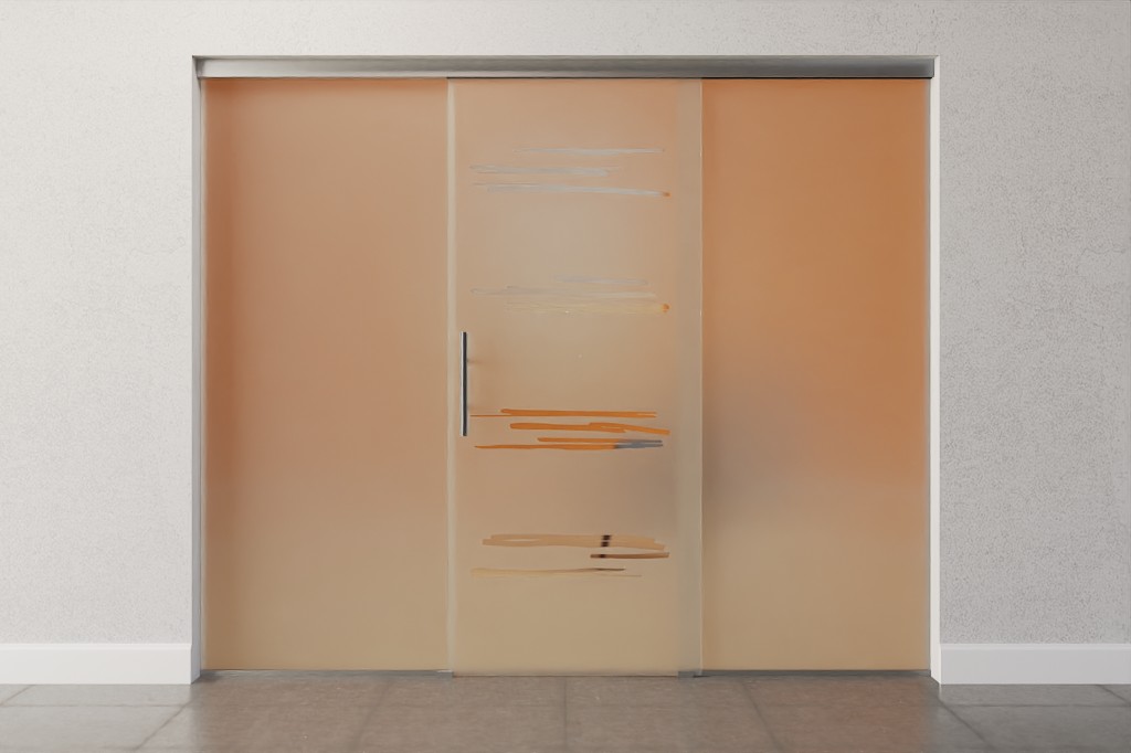 Całkowita szerokość zabudowy całoszklanej rozkłada się równomiernie na skrzydło drzwiowe i elementy boczne, dzięki czemu powstaje symetryczne wykończenie wizualne.