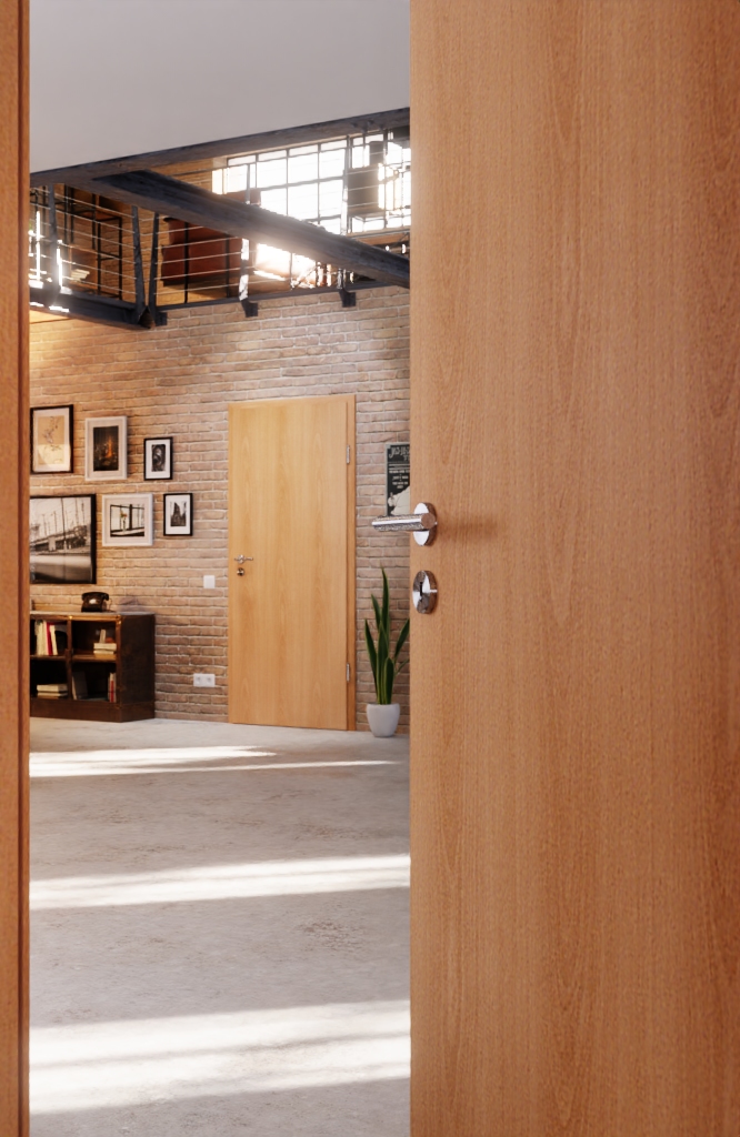 Dzięki swojej powierzchni nadaje się szczególnie do obiektów komercyjnych, takich jak zakłady produkcyjne, magazyny i biura. W tym przypadku papier dekoracyjny, ochrona overlay i wielowarstwowe papiery kraftowe są wspólnie prasowane. Dzięki temu jest odporna na ścieranie i zarysowania oraz wytrzymała na wpływy zewnętrzne w postaci ciepła, uderzeń i wilgoci. W przypadku wkładów drzwiowych masz do wyboru płytę wiórową i pełną wiórową.