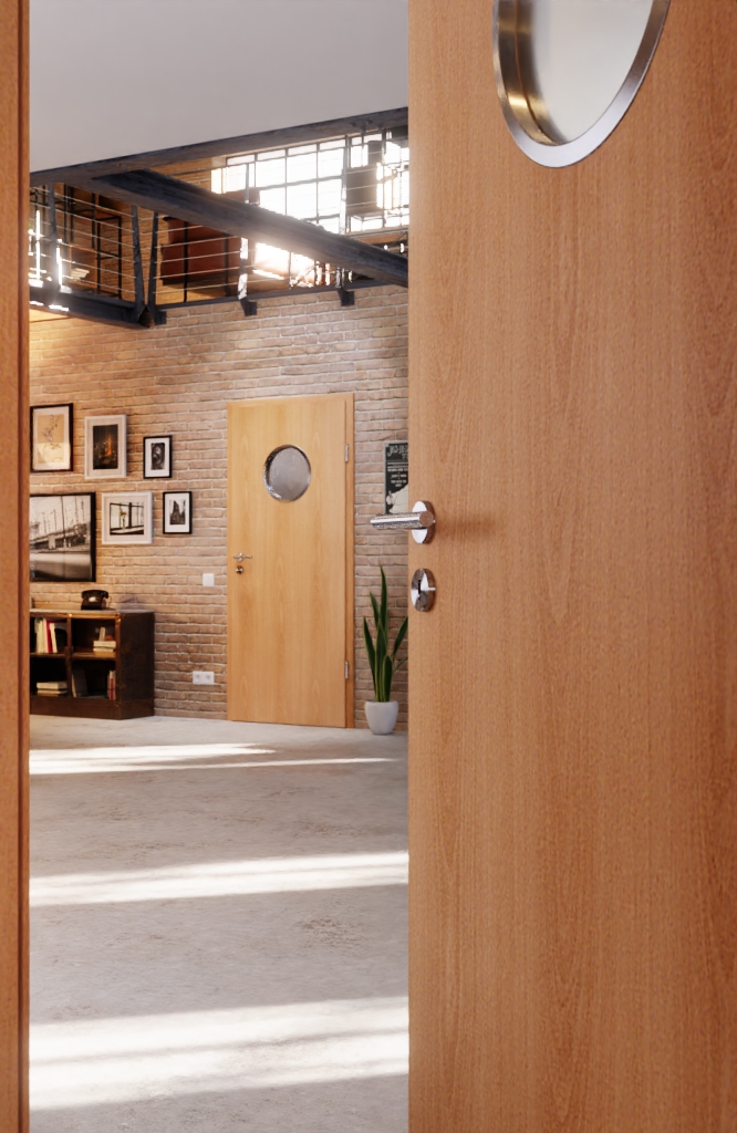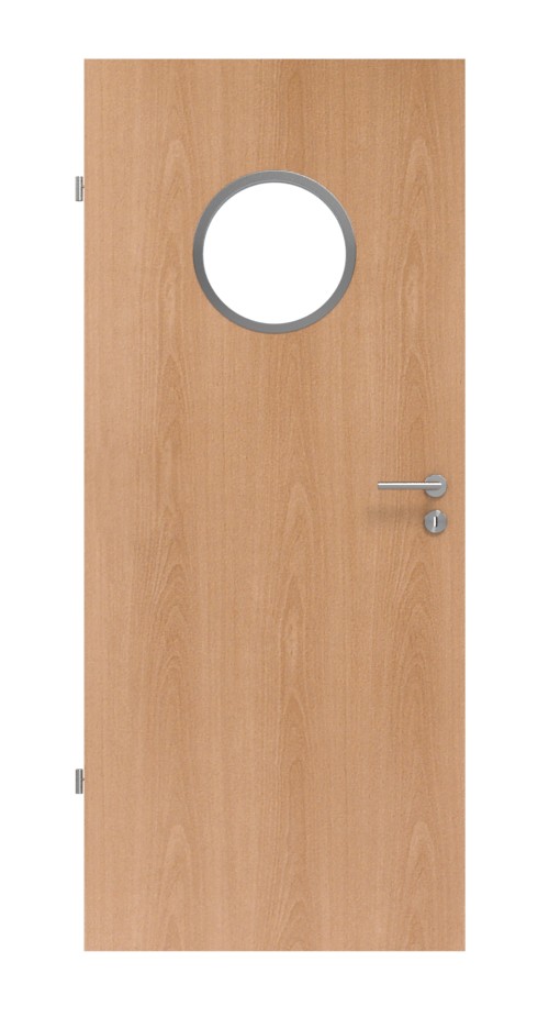 W górnej części drzwi znajduje się wycięcie na szkło. Dzięki podwyższonej pozycji widoczność w Twoim pomieszczeniu jest ograniczona. Standardowo oprawione w stal nierdzewną lub opcjonalnie w lite drewno bukowe, bulaj wpuszcza światło z góry.