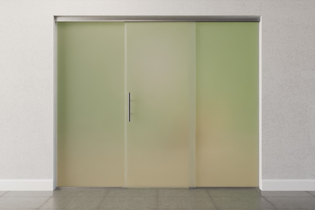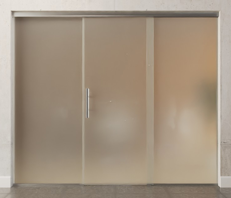 Całkowita szerokość systemu szklonego rozkłada się równomiernie na skrzydła drzwiowe i elementy boczne, co tworzy symetryczny wygląd.