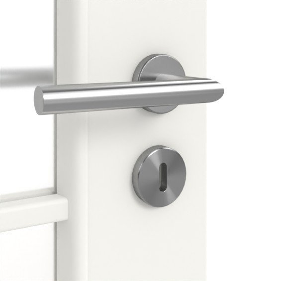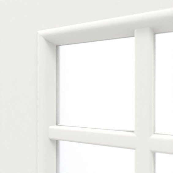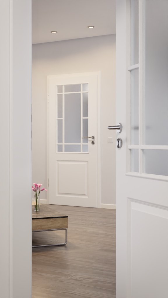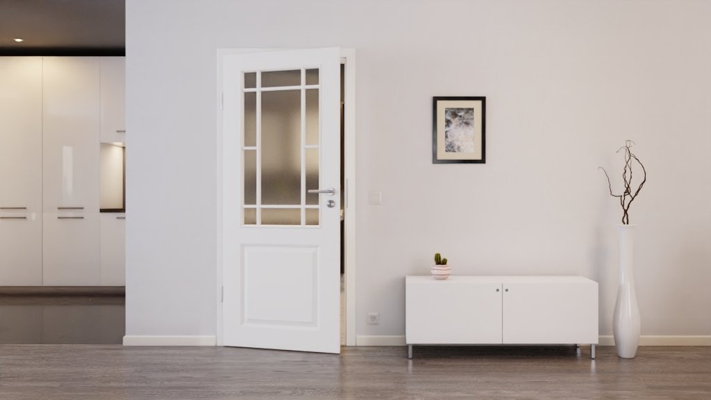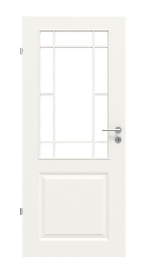 Dzięki wysokiej jakości białej powłoce lakierniczej w kolorze RAL 9010 lub RAL 9016 skrzydło drzwiowe zyskuje wspaniały połysk. Szklane otwory na wysokości oczu zapewniają przezroczysty i otwarty wystrój wnętrza. Profilowanie tworzy klasyczny wzór kasetowy.