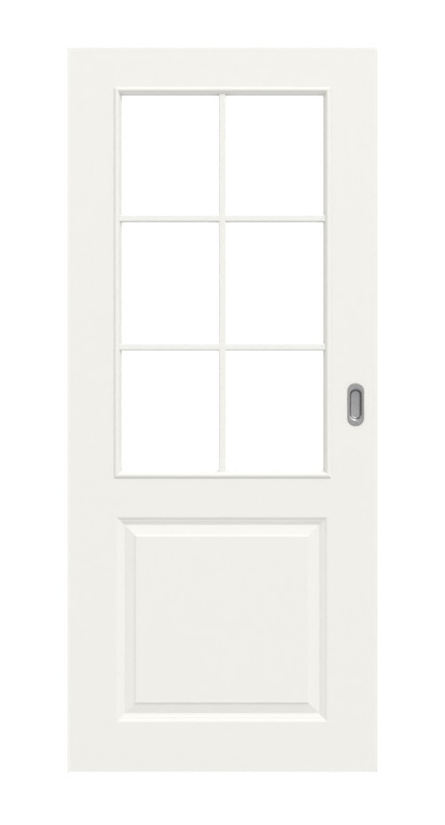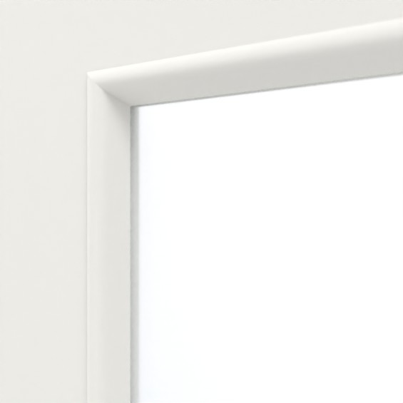 Dzięki wycięciu na szybę w górnej części drzwi do pomieszczeń wpada dużo światła. Jedna wzdłużna i dwie podłużne listwy tworzą geometryczny wzór na przezroczystej powierzchni. Białe wykończenie w kolorze RAL 9010 lub RAL 9016 nadaje drzwiom przesuwnym nowoczesny i elegancki wygląd.