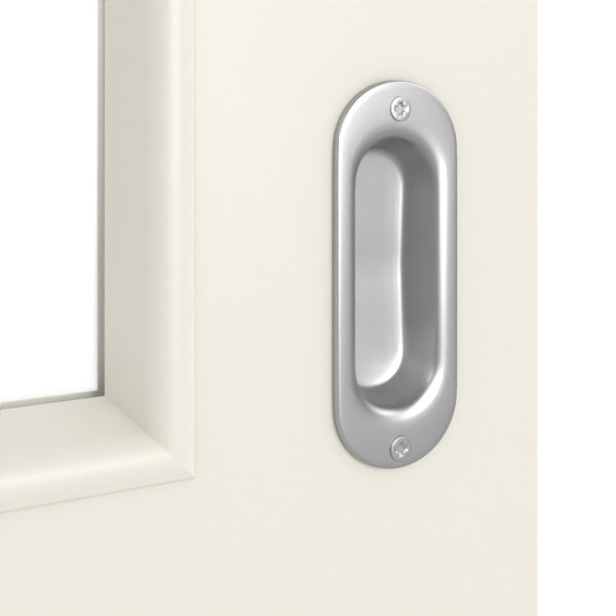 Dzięki profilowaniu na błyszczącym białym skrzydle drzwiowym, dostępnym w kolorze RAL 9010 lub RAL 9016, powstaje indywidualny, klasyczny wzór. Dwa wąskie przeszklenia w górnej części drzwi przesuwnych zapewniają otwarty i przezroczysty wygląd mieszkania.