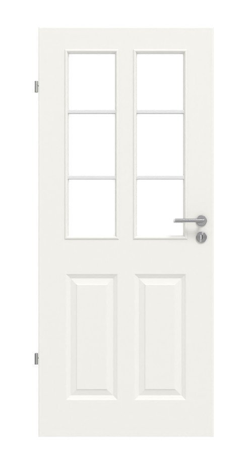Białe lakierowane skrzydło drzwiowe, dostępne w kolorze RAL 9010 lub RAL 9016, dzięki profilowaniu zyskuje klasyczny i elegancki charakter. Dzięki przeszkleniom do Twojego domu wpada dużo światła.