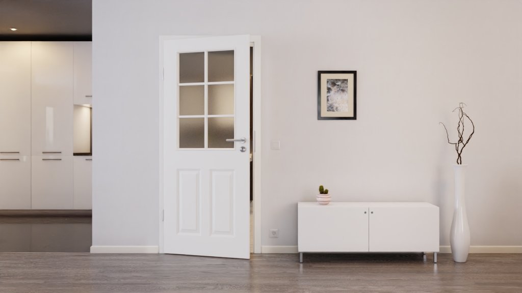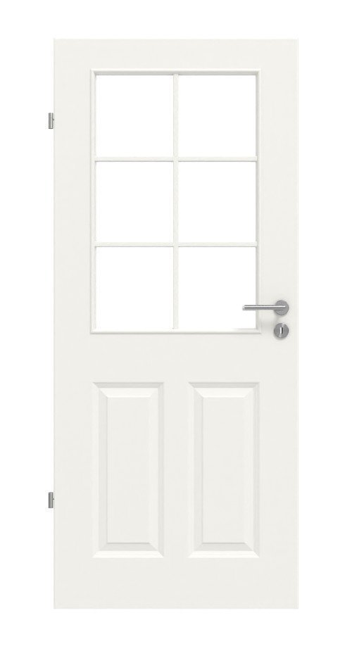 Profilowane skrzydło drzwiowe zyskuje nowoczesny wygląd dzięki wysokiej jakości białej powłoce lakierniczej w kolorze RAL 9010 lub RAL 9016 do wyboru. Dzięki przeszkleniu powstaje otwarta i przezroczysta aranżacja przestrzeni mieszkalnej.