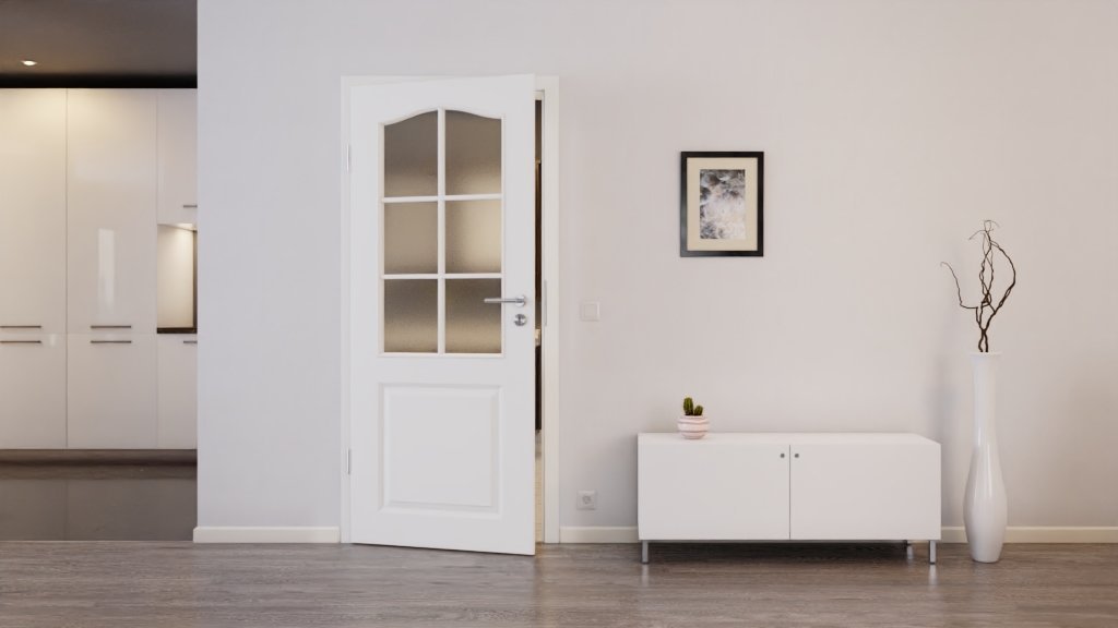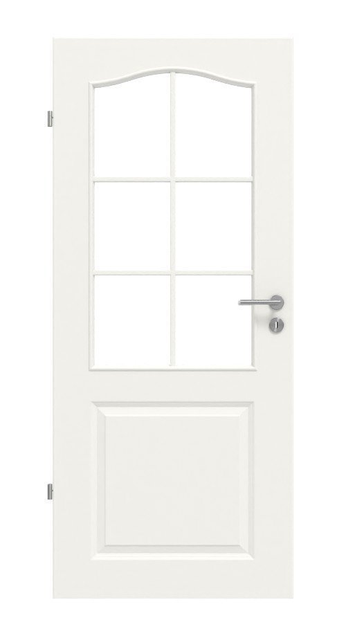 Białe lakierowane skrzydło drzwiowe, dostępne w kolorze RAL 9010 lub RAL 9016, dzięki profilowaniu wygląda klasycznie. Na wysokości oczu znajduje się duże przeszklenie. Białe szprosy tworzą geometryczny wzór na powierzchni szkła.