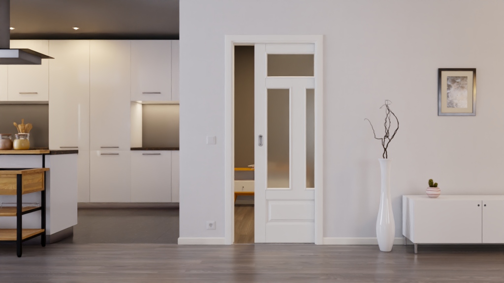 Komfortowa drzwi przesuwne w białym lakierze z właściwościami odpornymi na brud: