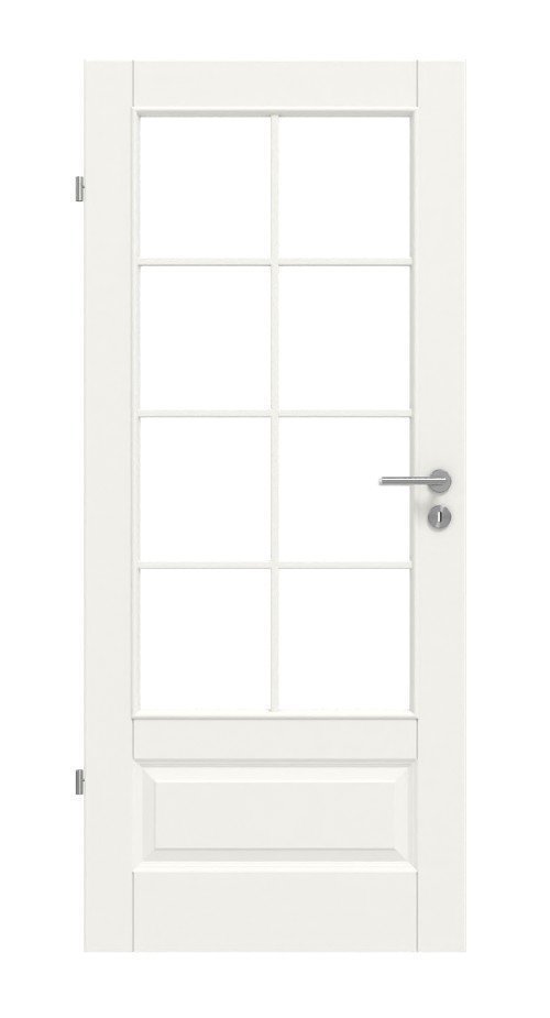 W górnej części drzwi znajduje się bardzo duża powierzchnia szklana. Dzięki temu do pomieszczeń wpada dużo światła, co zapewnia wyjątkowo otwartą i jasną atmosferę. Profilowanie na lakierowanym na biało skrzydle drzwiowym, dostępnym w kolorze RAL 9010 lub RAL 9016, nadaje drzwiom klasyczny wygląd.
