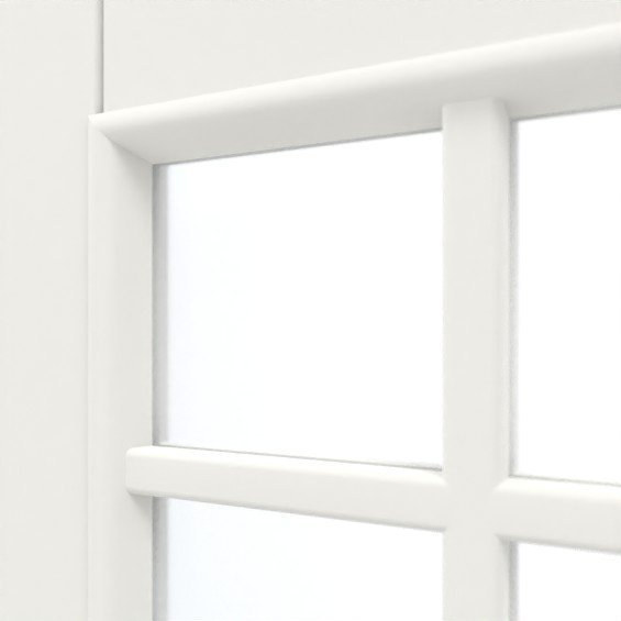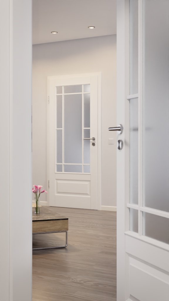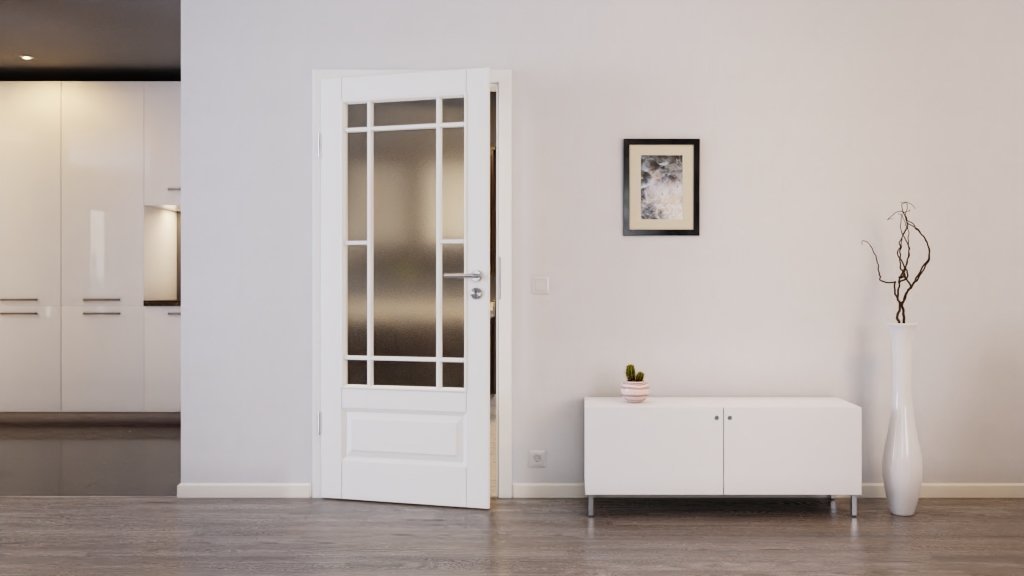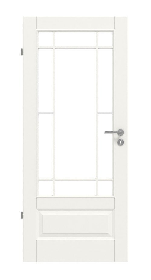 W białym, lakierowanym skrzydle drzwiowym, dostępnym w kolorze RAL 9010 lub RAL 9016, znajduje się wycięcie na szybę, które zapewnia doskonały dostęp światła do wnętrza domu. Profilowanie na skrzydle drzwiowym nadaje drzwiom klasyczny wygląd.