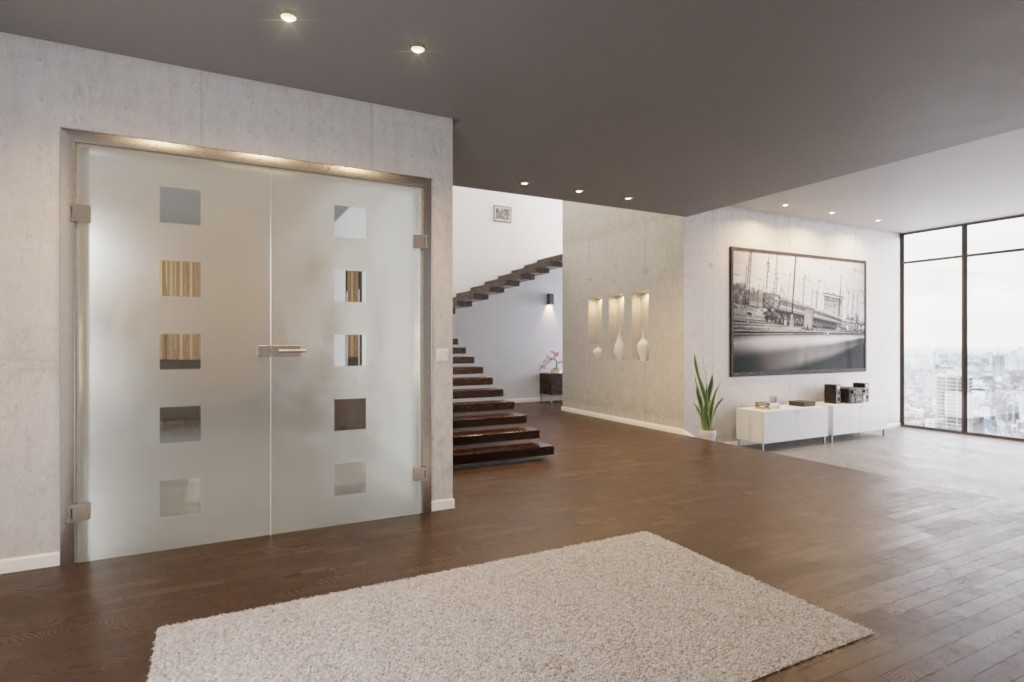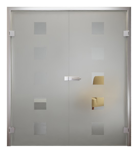 Satynowane skrzydło czynne i bierne drzwi dwuskrzydłowych z jednolitym kwadratowym motywem z przezroczystego szkła. Przebiega ona pionowo przez oba skrzydła drzwiowe w regularnych odstępach i zapewnia subtelny prześwit. Motyw ten przyczynia się również do harmonijnego rozkładu światła i tworzy przyjazną, jasną atmosferę w pomieszczeniu.