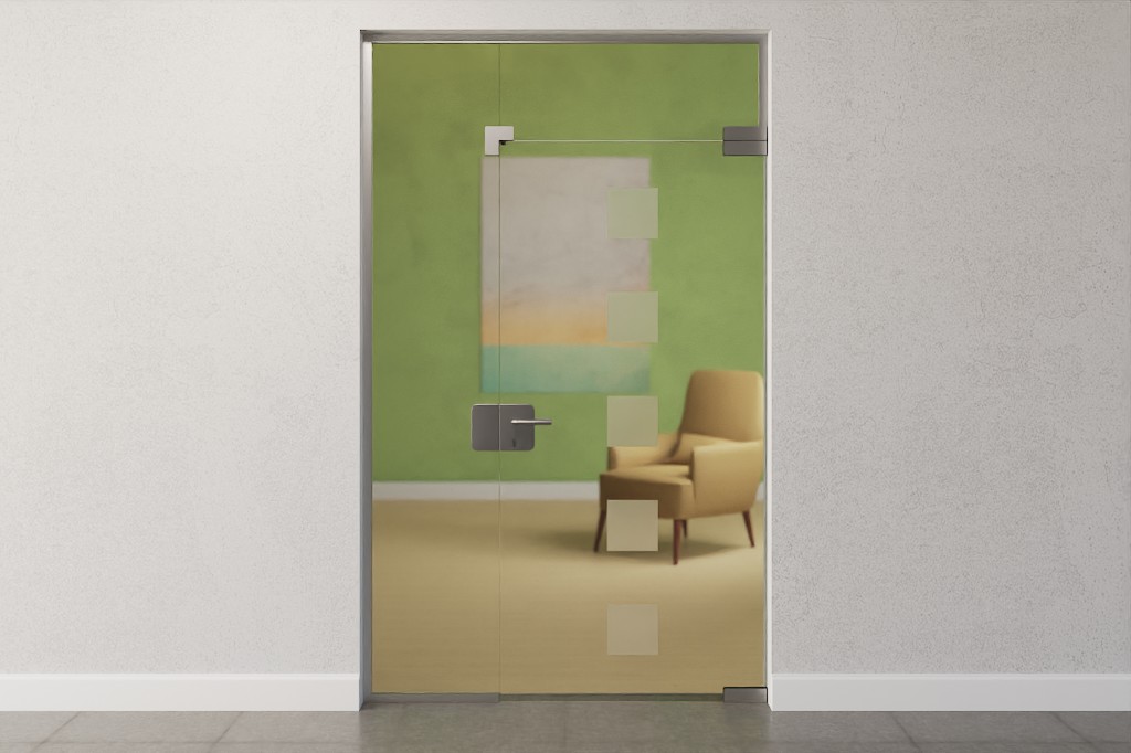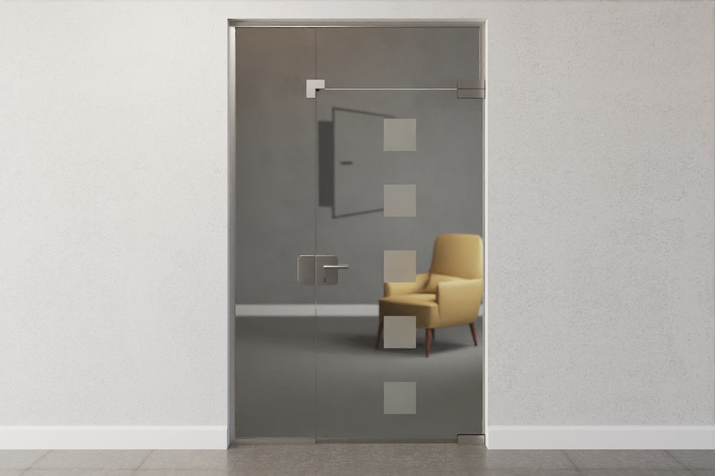 Przezroczysta szklana powierzchnia tworzy pełne światła połączenie między pomieszczeniami. Stylowo wyróżnia się na tym tle pięć matowych kwadratów , ułożonych równomiernie jeden nad drugim.