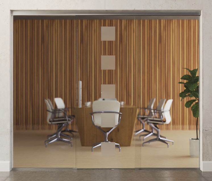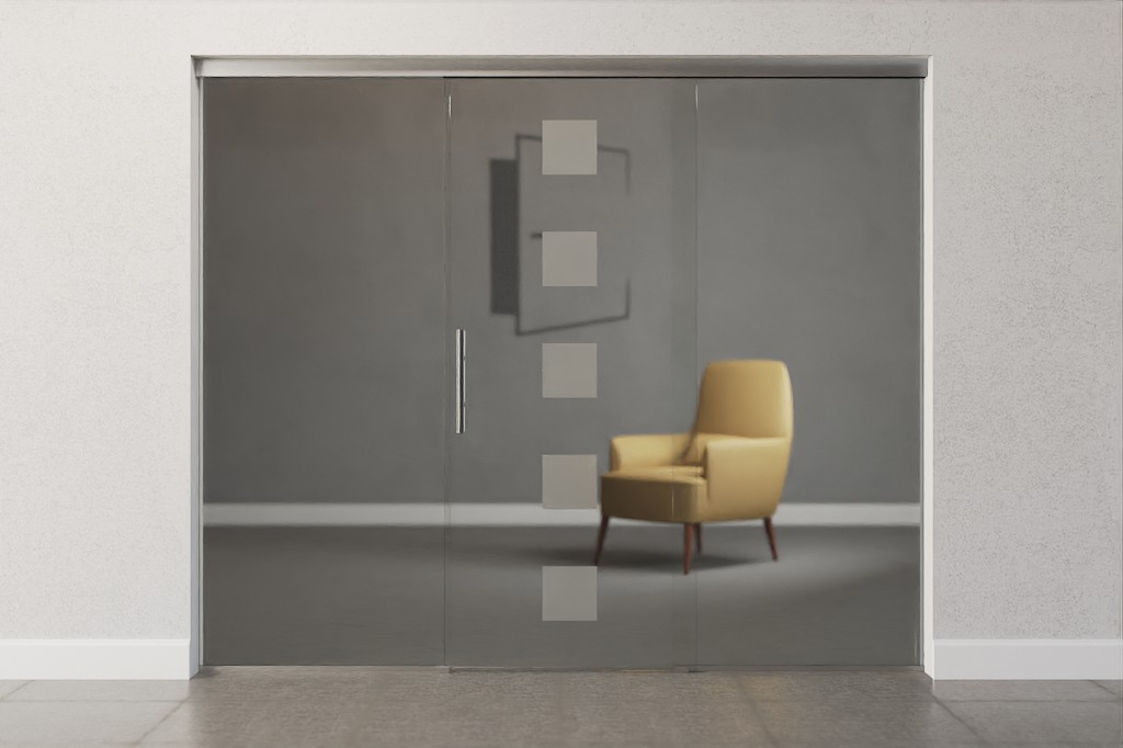Całkowita szerokość szklanej konstrukcji jest równomiernie rozłożona na skrzydło drzwiowe i elementy boczne, dzięki czemu powstaje symetryczne wykończenie wizualne.