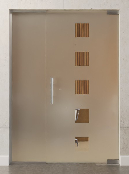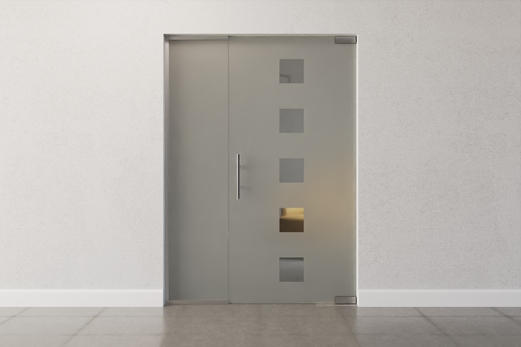 Elegancka drzwi przeszklone z boczną szybą z specjalnie pokrytego szkła hartowanego: