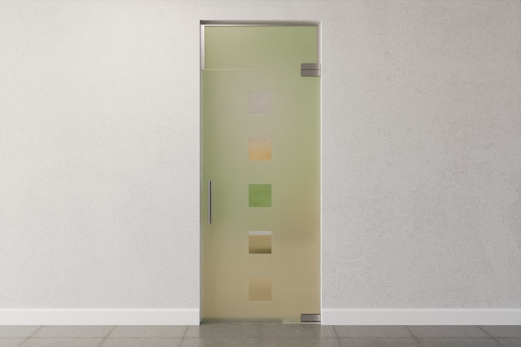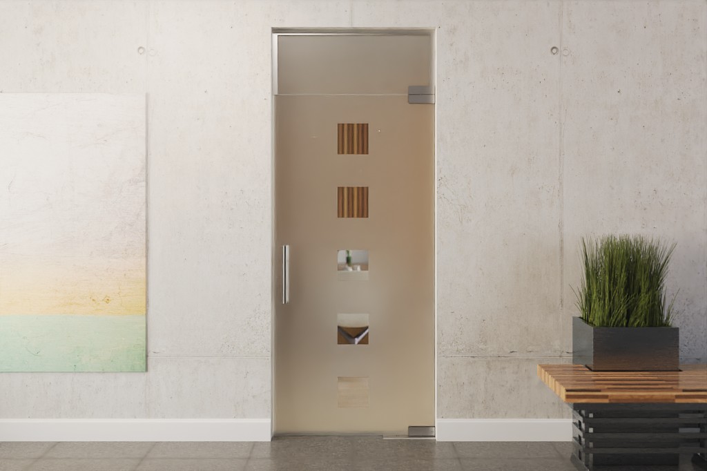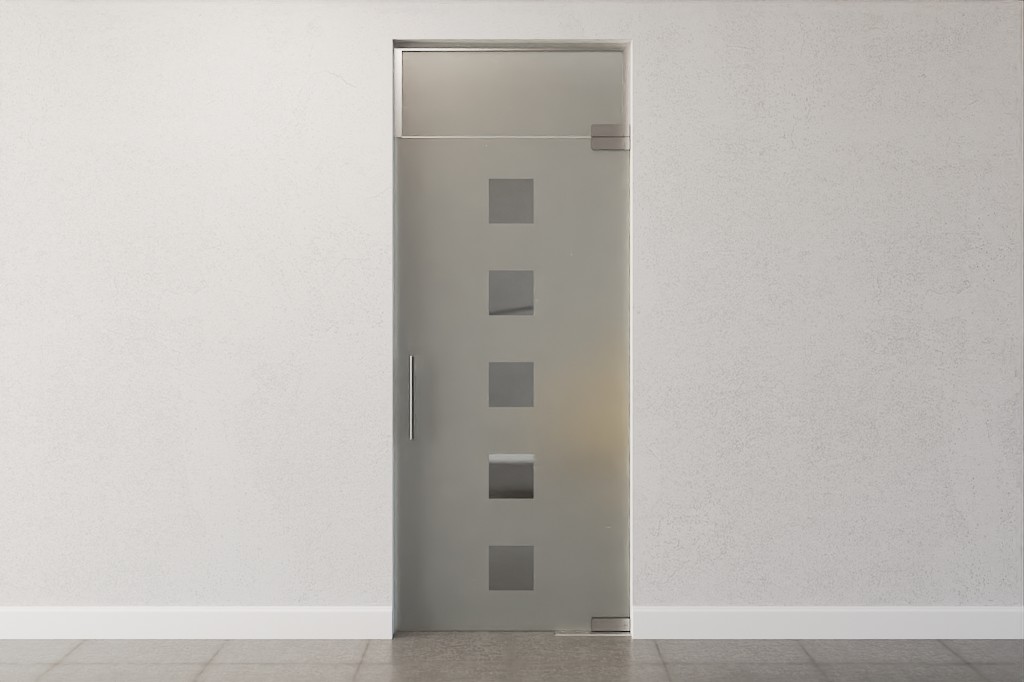 Pięć kwadratów z szkła przezroczystego stylowo wyróżnia się na klasycznym, matowym szkle. Są one rozmieszczone w równych odstępach pośrodku skrzydła drzwiowego.