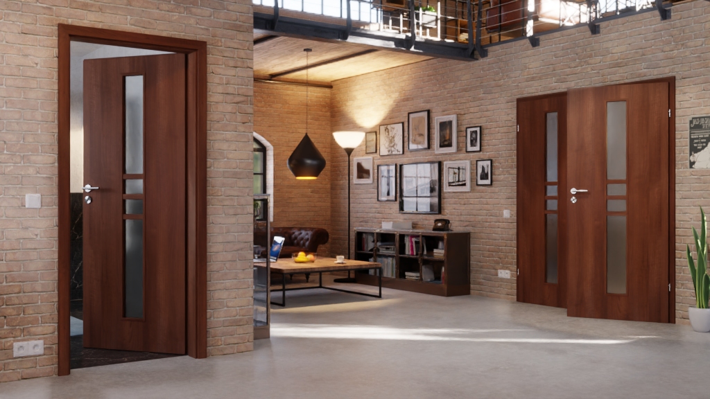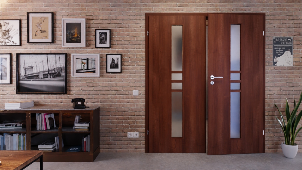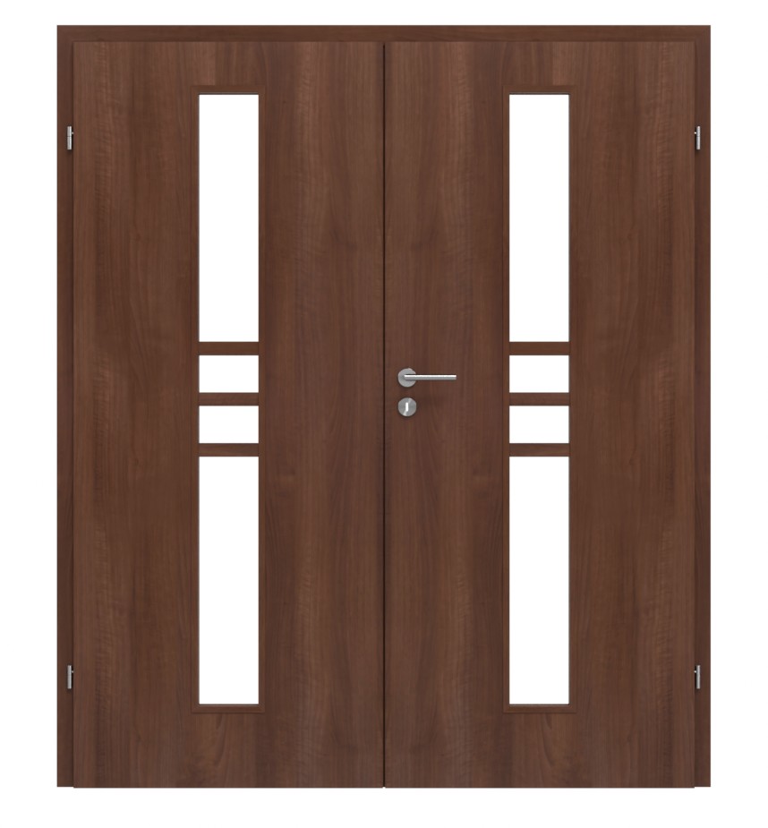 Atrakcyjne, dwuskrzydłowe drzwi z pionowymi pasami świetlnymi i powierzchnią Primo z zaokrąglonymi krawędziami Postforming: