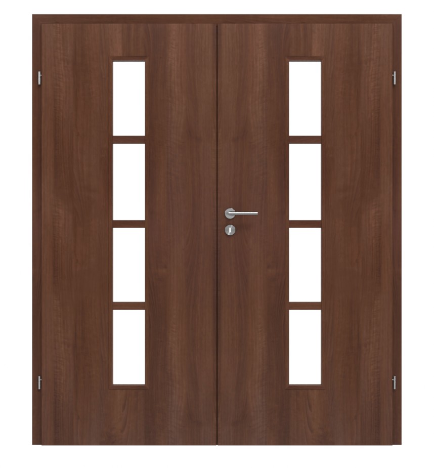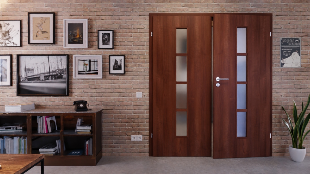 Oryginalne, dwuskrzydłowe drzwi z wycięciami z matowego szkła i powierzchnią w kolorze orzecha: