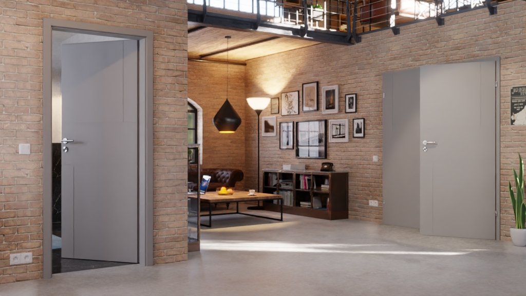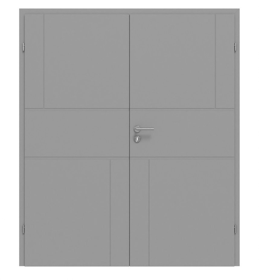 Nowoczesne drzwi podwójne w kolorze szarym RAL 7004 z frezowanymi detalami: