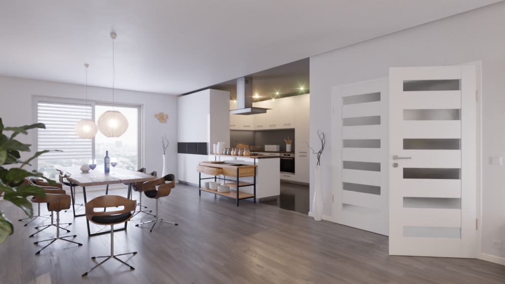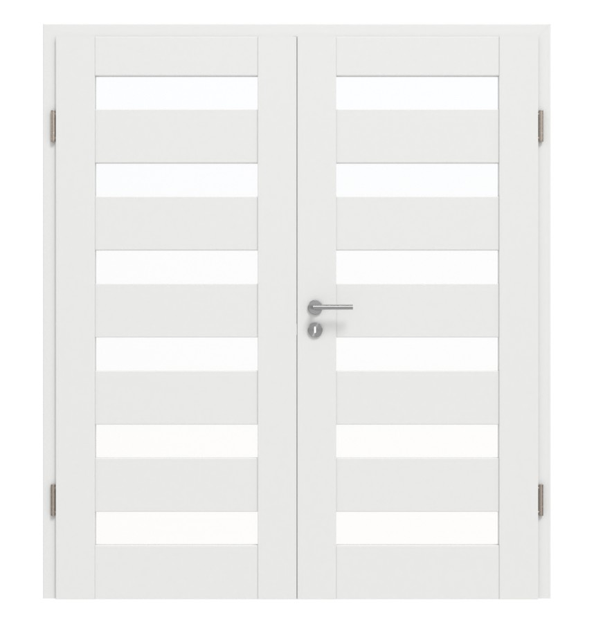 Dzięki białej powierzchni CPL drzwi dwuskrzydłowe można zintegrować z wieloma pomieszczeniami mieszkalnymi. Matowanie zapewnia dyskretne wykończenie wizualne. Dodatkowo zastosowano satynowane szkło ESG o grubości 4 mm, które zapewnia jasność w pomieszczeniu.