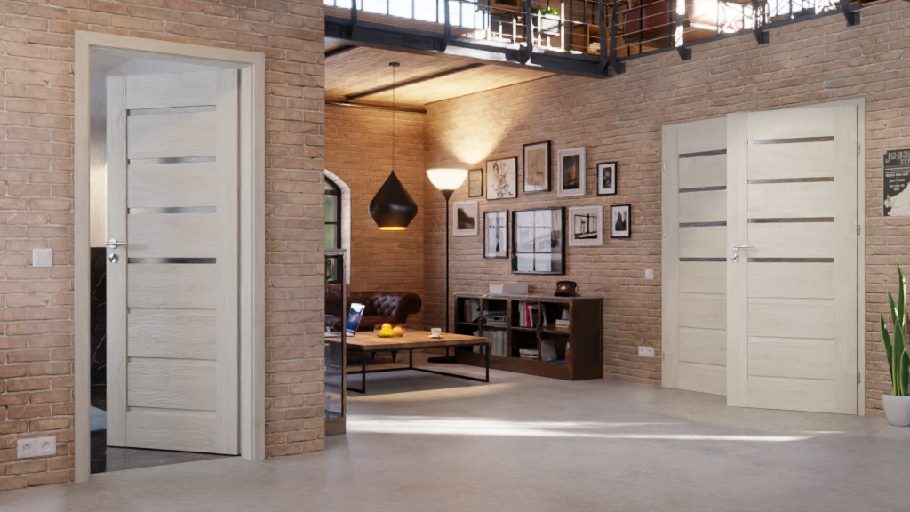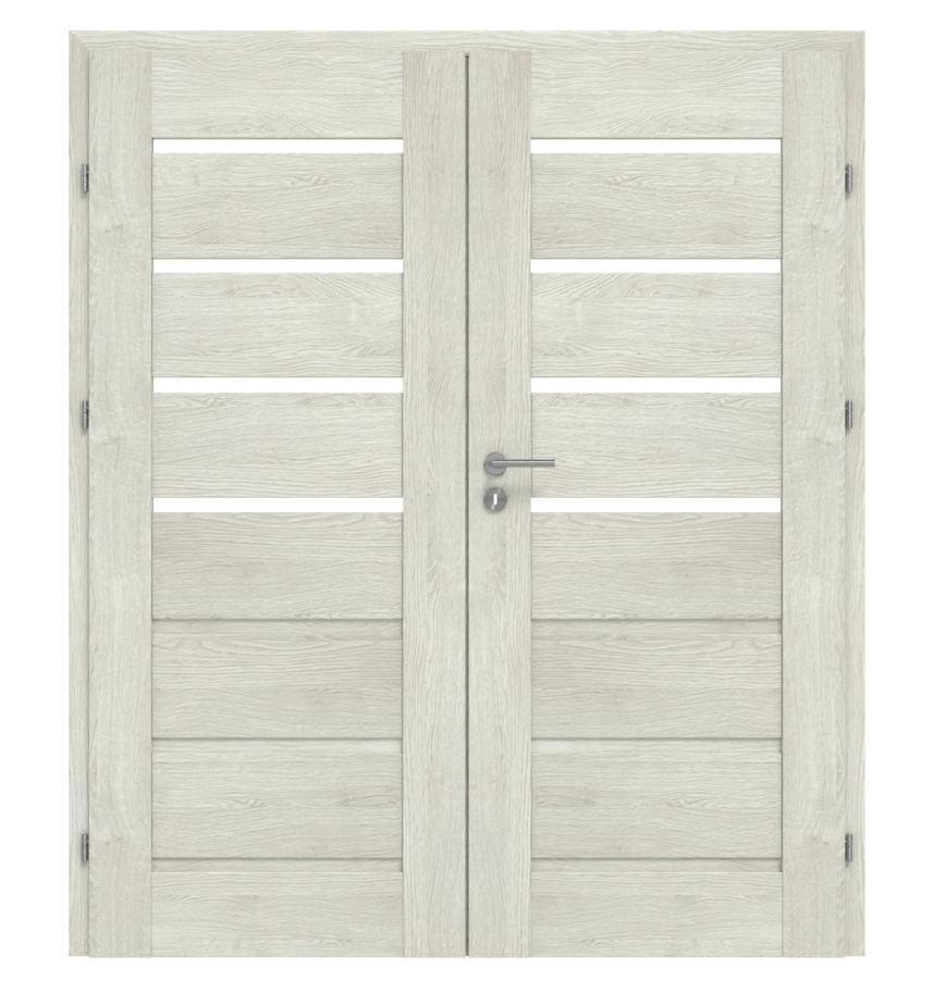 Atrakcyjne dwuskrzydłowe drzwi wewnętrzne z zintegrowanymi elementami ramy MDF i przeszkleniami z matowego szkła: