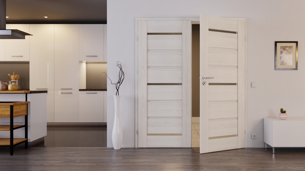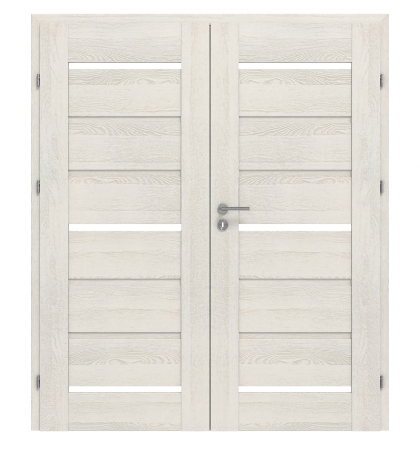 Stylowe drzwi podwójne z wytrzymałymi skrzydłami drzwiowymi i satynowanym przeszkleniem: