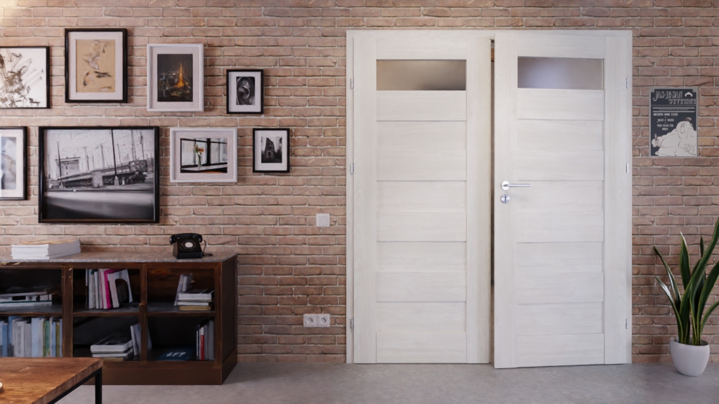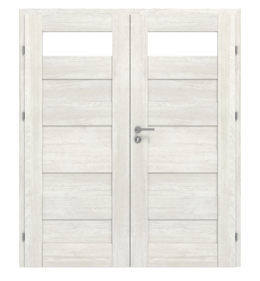 W tej dwuskrzydłowej drzwi wewnętrznej zintegrowane elementy ramowe MDF, powierzchnia CPL w dekorze Norweski Jesion, a także satynowane przeszklenia i panele z płyt HDF tworzą idealny komplet: