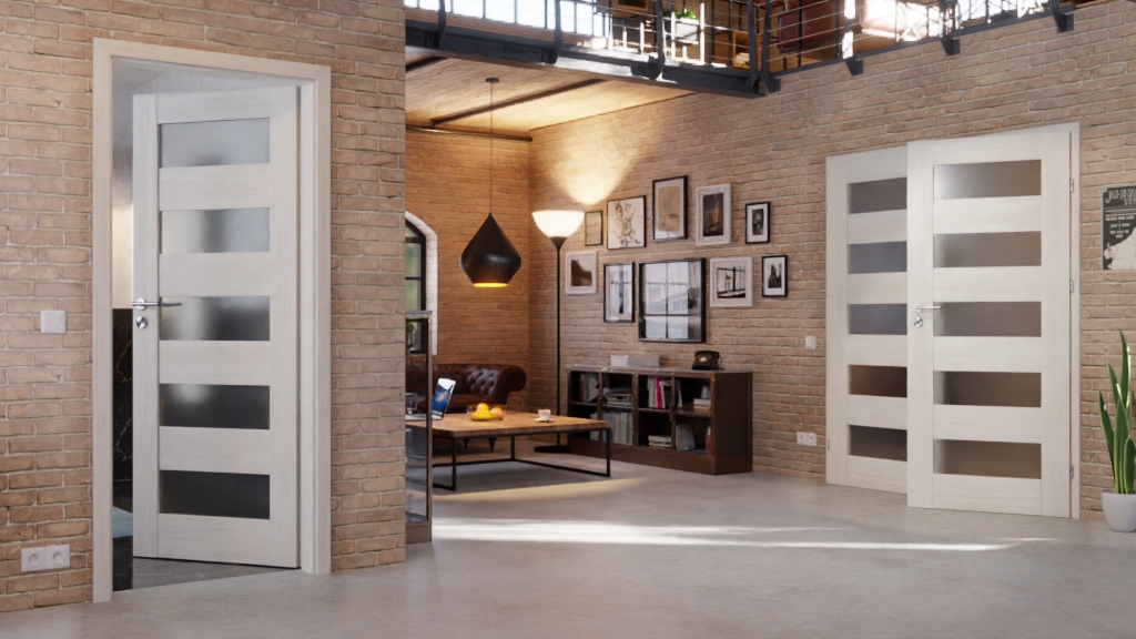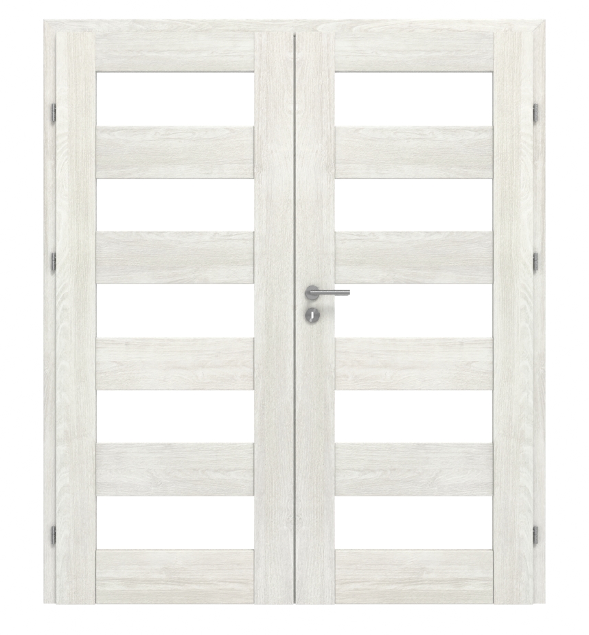 W przypadku tych drzwi podwójnych rama MDF, powierzchnia CPL w dekorze Jesion norweski oraz wstawki z matowego szkła tworzą idealny komplet: