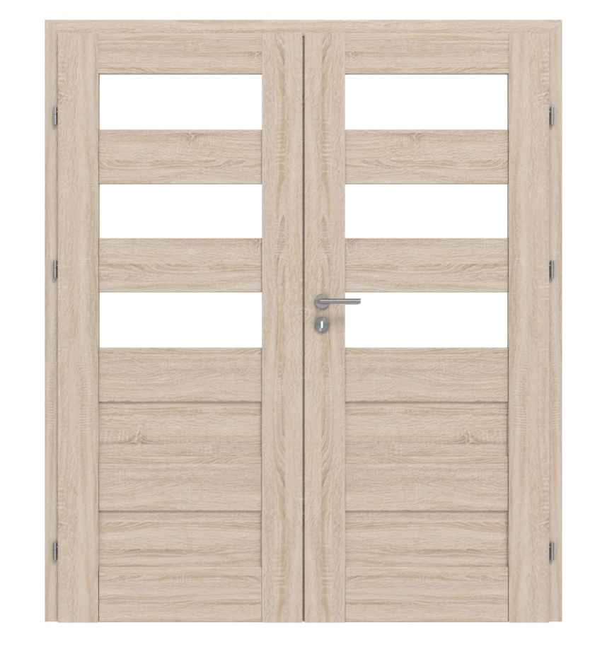 W przypadku tych drzwi ramowych dwuskrzydłowych elementy ramy z MDF, powierzchnia 3D Look, a także satynowane przeszklenia i panele z płyt HDF tworzą idealny komplet: