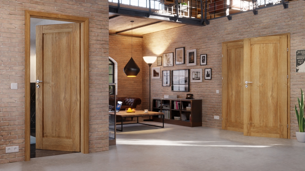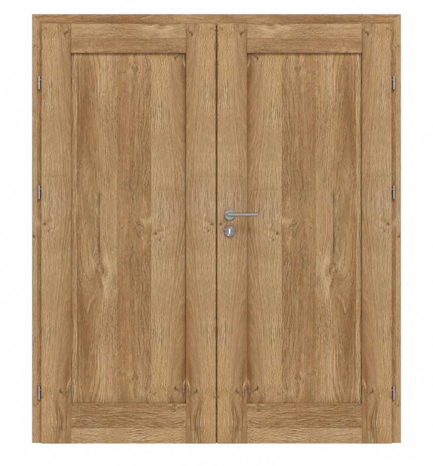 Dwuskrzydłowe drzwi wewnętrzne Kofano z efektem kasetowym i dekorem drewna