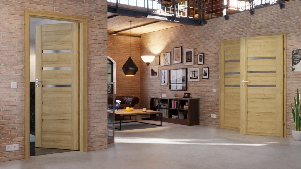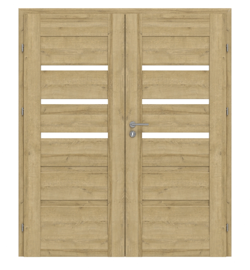 Oryginalne drzwi wewnętrzne podwójne z zintegrowanymi elementami ramy MDF i pasami świetlnymi z satynowego szkła: