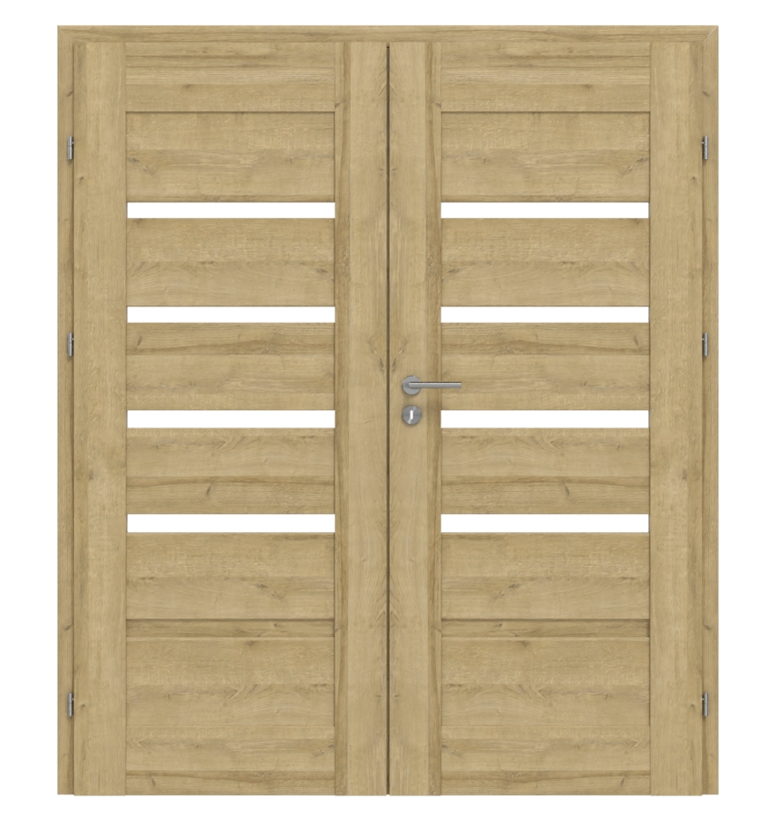 Nowoczesne drzwi wewnętrzne podwójne z elementami ramowymi MDF i pasami świetlnymi z matowego szkła: