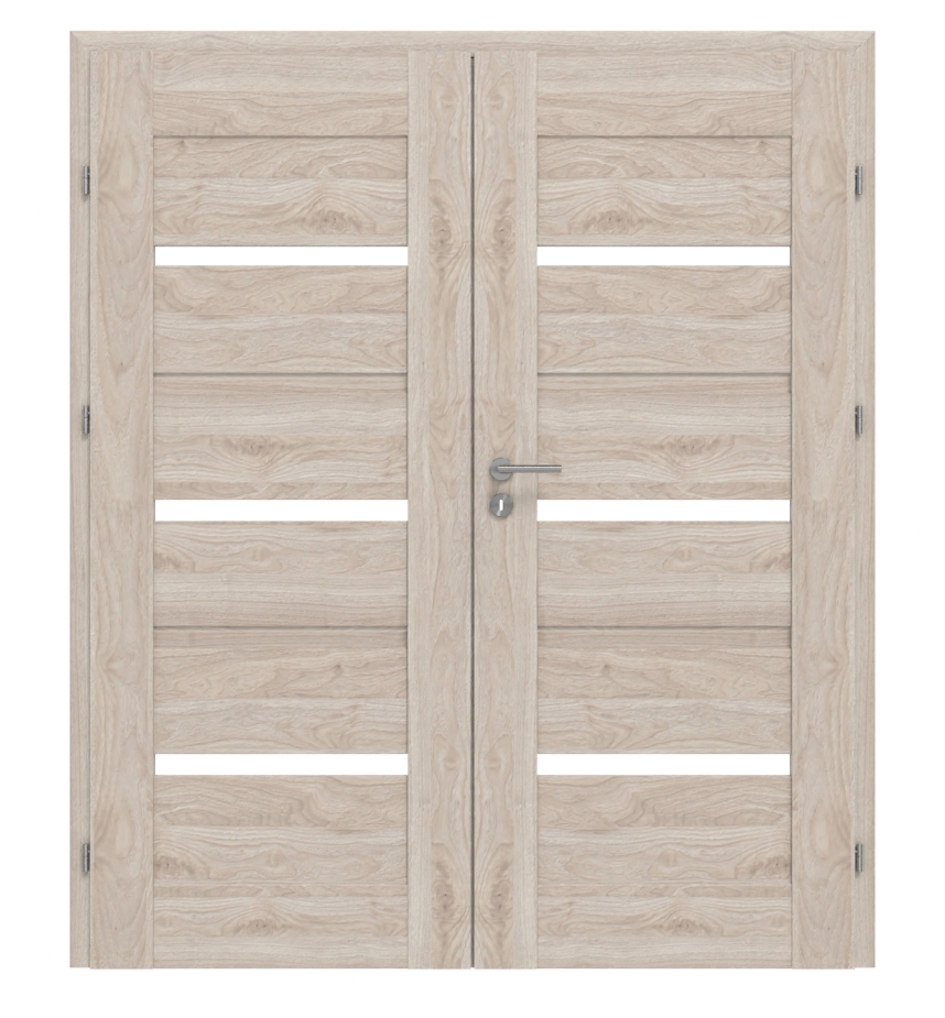 Oryginalne drzwi wewnętrzne podwójne z dwoma skrzydłami ramowymi z płyt MDF oraz pasami świetlnymi z matowego szkła: