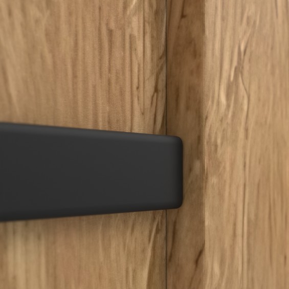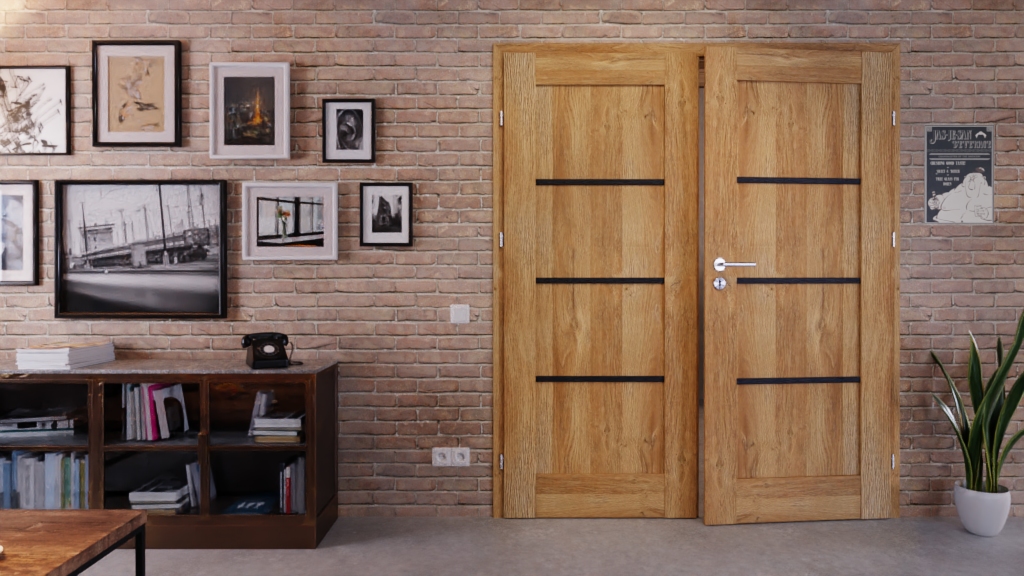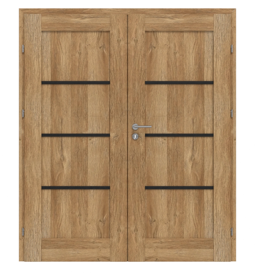 Ponadczasowe drzwi dwuskrzydłowe Mamba z dekorem drewna i czarnymi szprosami