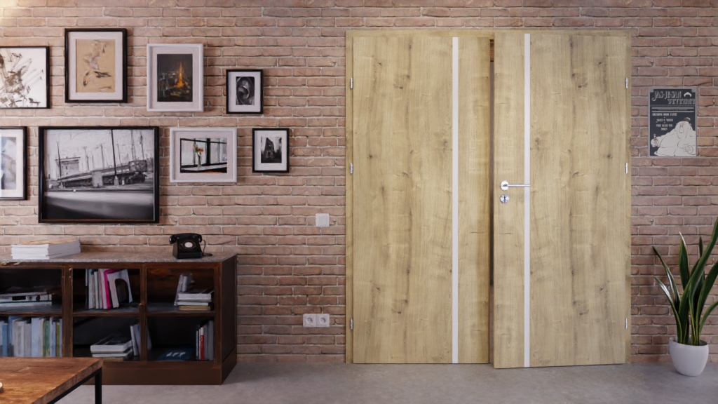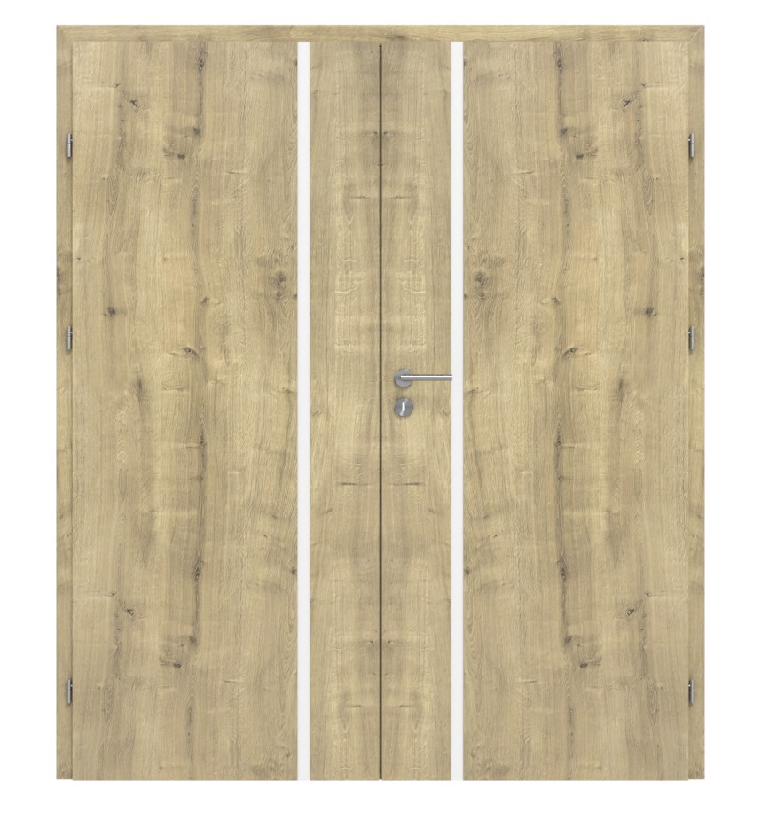 Drzwi podwójne z wypełnieniem z płyty wiórowej otworowej i powierzchnią CPL w dekorze dębu: