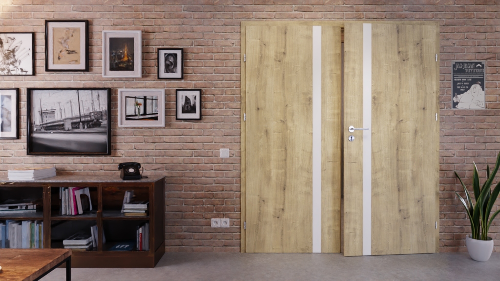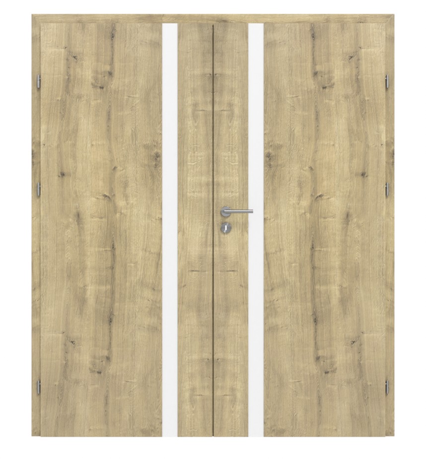 Drzwi podwójne z wypełnieniem z płyty wiórowej otworowej, dostarczane wraz z ościeżnicą: