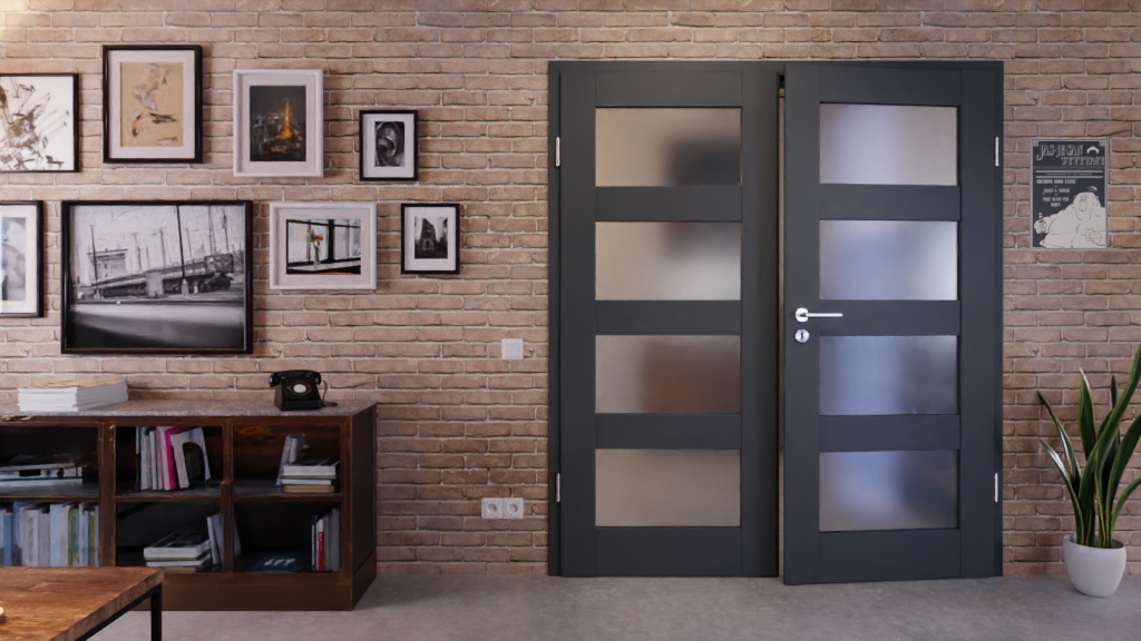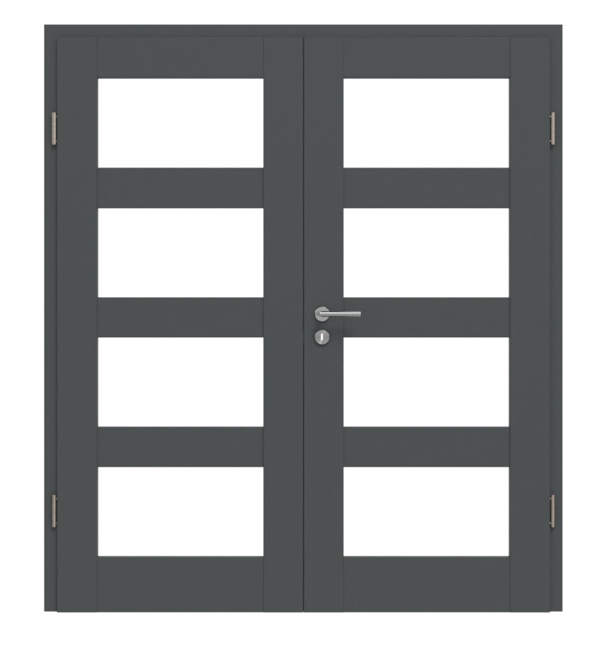 Model drzwi wewnętrznych z podwójnymi skrzydłami, w tym rama MDF, 3-częściowe zawiasy i kątowe wykończenie krawędzi: