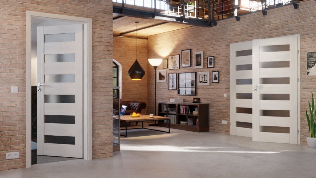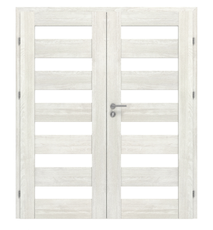 W przypadku tych drzwi ramowych dwuskrzydłowych elementy ramy MDF, powierzchnia CPL oraz satynowane przeszklenia tworzą idealny komplet: