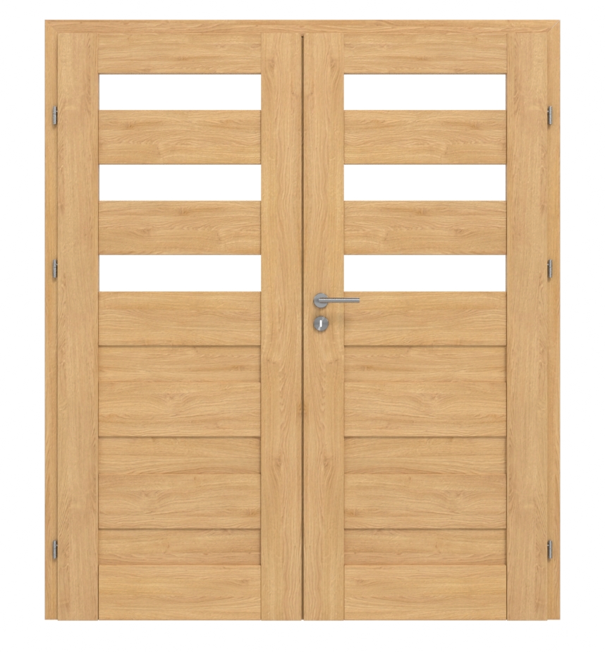 W przypadku tych drzwi podwójnych elementy ramowe z MDF, powierzchnia 3D Look w kolorze Dąb szary, a także satynowe wstawki szklane i panele HDF tworzą idealny komplet: