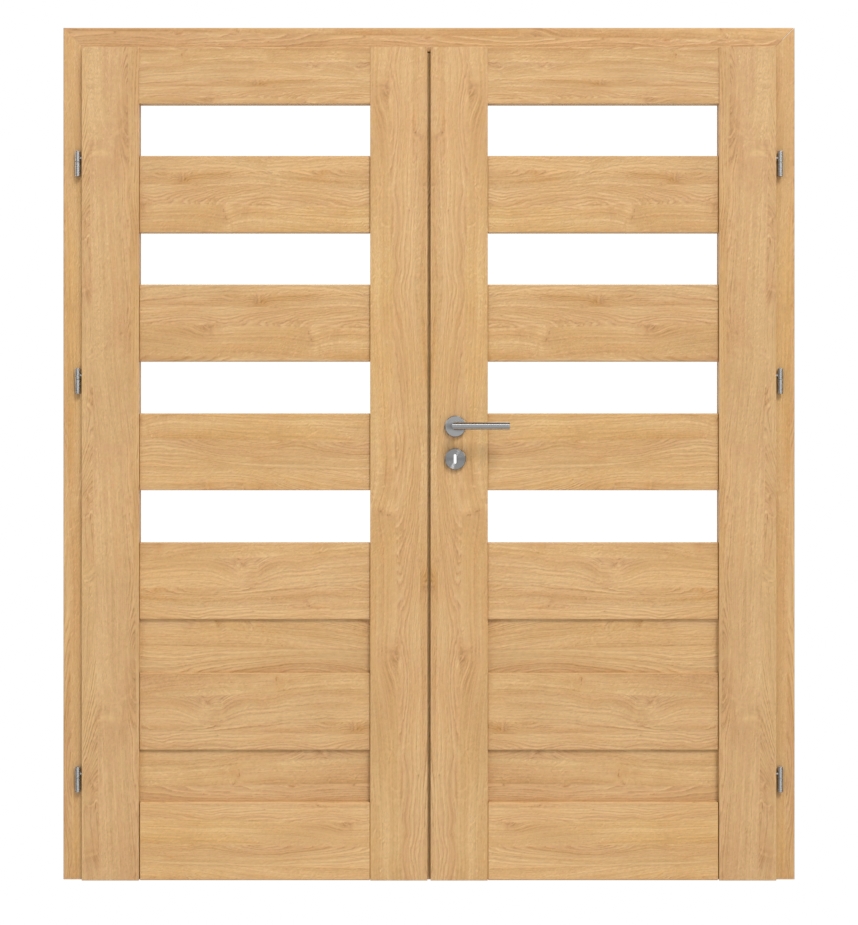 W tej dwuskrzydłowej drzwi wewnętrznej zintegrowane elementy ramowe MDF, powierzchnia 3D Look, satynowe przeszklenia oraz panele HDF tworzą idealny komplet: