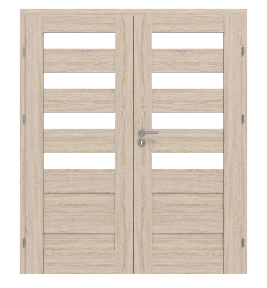 W przypadku tych drzwi podwójnych elementy ramowe z MDF, powierzchnia 3D Look w dekorze Dąb Sonoma, satynowe przeszklenia oraz panele HDF tworzą idealny komplet: